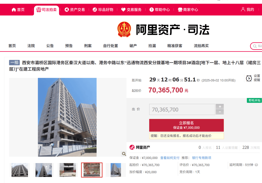 大约2周前,地产房剑推送了一篇文章《》,讲到的是中国电建在港务区的酒店资产拍卖转让。 就在这两天,港务区又有一宗酒店资产被摆上了阿里资产拍卖平台,这一次是司法拍卖。 这是位于秦汉大道旁的一座在建商务酒店资产,将于今年9月初进行拍卖。 01 迅通物流西安分拨基地酒店将被拍卖 近日,阿里司法拍卖平台上发布了【西安市灞桥区国际港务区秦汉大道以南、港务中路以东"迅通物流西安分拨基地一期项目3[地下一层、地上十八层 (裙房三层)]"在建工程房地产】标的物拍卖信息。 正如标的物名称提到的,该标的物是讯通物流西安分拨基地的一座酒店资产。 这座酒店总建筑面积约20139㎡(地上18978㎡+地下1161㎡),从现状来看主体结构已经封顶,外立面、室外和室内装修尚未施工,目前该建筑所在的土 地使用年限还剩下31.77年(2057年2月28日止),土地用途为商务金融用地。 此次进行拍卖的这座酒店资产评估价为7036.57万元,将按照评估价作为起始价进行拍卖,竞买保证金为700万元,拍卖时间为2025年9月2日10时开始。 值得注意的是,该标的物的拍卖非产权方资产转让,而是司法拍卖,执行案号为(2024)陕0112执恢4186号。 ...