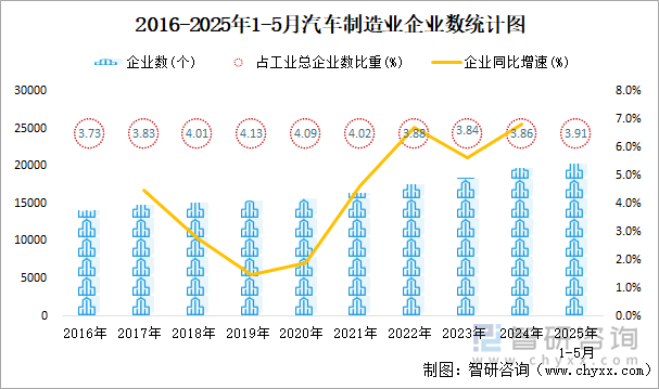 2025年1-5月汽车制造业企业有20288个,同比增长4.79%