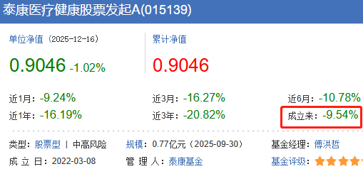 作为医疗类主题的权益基金,泰康医疗健康股票自然重仓医药股,从今年三季报中的前十大重仓股 看,该基金持有晶泰控股、康龙化成、方舟健客、三生制药、昭衍新药、九安医疗、奕瑞科技、羚锐制 药、百普赛斯、毕得医药。但从走势上看,尽管多数个股在三季度都随市场整体上涨而大涨,然而其 A/C份额在三季度里却仅上涨了5.43%和5.30%,不知道是不是多数重仓股已经被更换的原因。 如果仅以三季度的重仓股看,进入到四季度,这些个股大都出现回调,比如第一大重仓股晶泰控股 就在四季度以来下跌了近35%,方舟健客更是在10月份后大跌38%,还有多只个股跌幅都超过10%。而 唯一一只今年前三个季度始终出现在前十大重仓股中的羚锐制药,股价在2025年度内还处于小幅下跌状 态。 (责任编辑:康博) 来源:天天基金网 中国经济网北京12月17日讯 今日,新浪发布《牛市亏损!泰康基金:"医疗健康A"年内净值下跌 12.54%,成立以来仍处于浮亏》一文。文中称,截至2025年12月15日,泰康医疗健康A年内净值下跌 12.54%,成立3年多该基金净值累计跌超8%。该基金部分三季度末重仓股自四季度以来股价下跌超过 30%,包括晶泰控股、方舟健客等。 ...