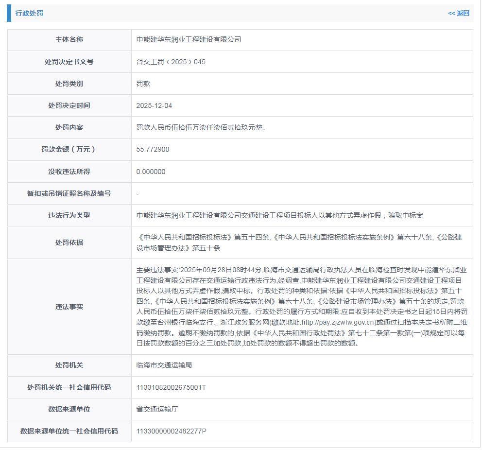 核心事件 - 中能建华东润业工程建设有限公司因在交通建设工程项目投标中弄虚作假、骗取中标,被处以罚款人民币55.7729万元 [1][2] - 违法行为发生时间为2025年09月28日,处罚决定时间为2025年12月04日,处罚机关为临海市交通运输局 [1][2] - 处罚依据包括《中华人民共和国招标投标法》第五十四条、《中华人民共和国招标投标法实施条例》第六十八条及《公路建设市场管理办法》第五十条 [1][2] 公司背景 - 公司前身为浙江润业建设有限公司,创建于2006年,于2020年9月被中国能源建设集团华东建设投资有限公司收购90%股权,成为其控股子公司 [3] - 公司注册资本为11111万元 [2] - 公司定位为专业从事非电基础设施建设的工程公司,主营业务涵盖公路、市政、桥梁隧道及港航等领域的市场开发、工程建设和运营维护 [3] - 公司承担着华东建投在融资建设项目管理、非电业务拓展、非电人才培养及深化改革探索等方面的重要功能 [3]