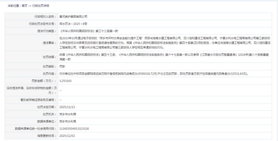 近日,信用中国(江西)公示了黄河养护集团有限公司的行政处罚决定。行政处罚决定书文号萍水罚决﹝2025﹞8号显示,在2023年10月通过电子投标的"萍 乡市坪村水库安全能力提升工程"项目与湖南水建工程有限公司、四川佳和建设工程有限公司、宁夏水利水电工程局有限公司等三家投标人存在投标文件 异常及投标报价呈规律性差异的行为。根据《中华人民共和国招投标法实施条例》第四十条第(四)项的规定,黄河养护集团有限公司与湖南水建工程有限 公司、四川佳和建设工程有限公司、宁夏水利水电工程局有限公司等三家投标人存在相互串通投标的行为。 依据《中华人民共和国招投标法》第五十三条、《中华人民共和国招投标法实施条例》第六十七条第一款以及参照《江西省水行政处罚裁量基准》(2024 年)第八十条裁量基准第一款,萍乡市水利局对黄河养护集团有限公司处中标项目金额陆佰伍拾万陆仟叁佰贰拾陆元柒角贰分(6506326.72元)千分之五的罚 款,即处罚款叁万贰仟伍佰叁拾壹元陆角叁分(32531.63元)。 | 当前位置:首页 >>行政处罚详细 | | --- | | 行政相对人名称: | | | --- | --- | | 行政处罚决定书文号: 萍水罚 ...