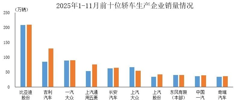 数据简报 | 2025年1-11月前十位轿车生产企业销售情况简析