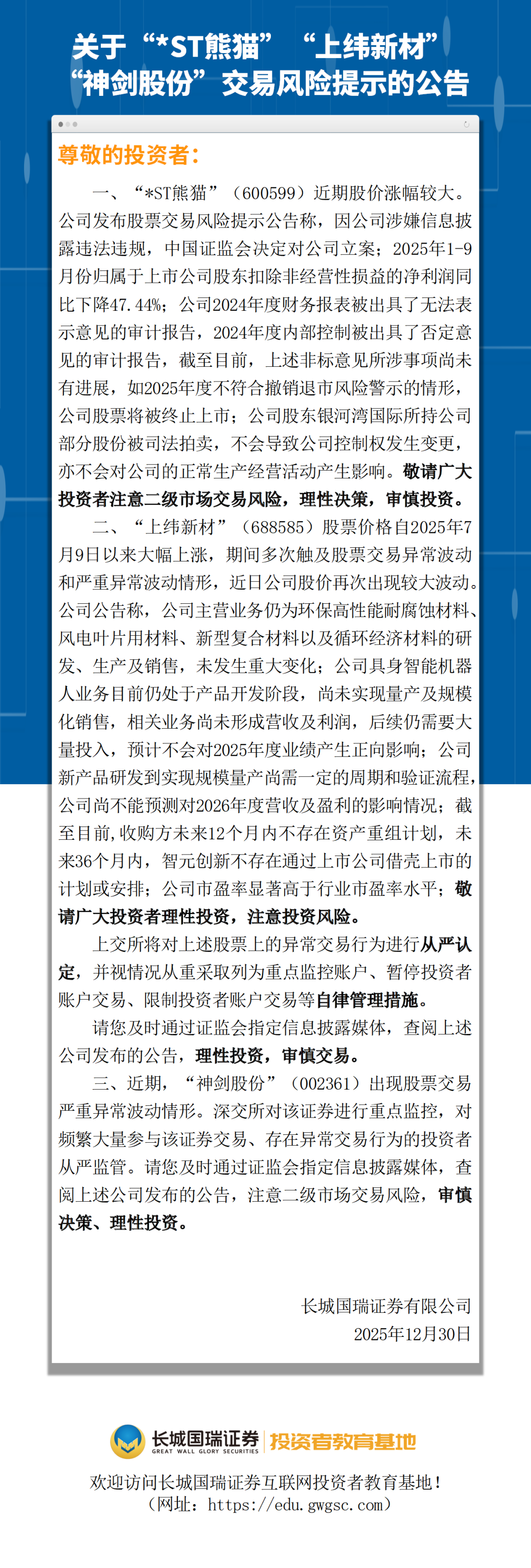关于“*ST熊猫”的风险提示 - 公司近期股价涨幅较大[1] - 公司因涉嫌信息披露违法违规被中国证监会立案[1] - 2025年1-9月归属于上市公司股东的扣除非经常性损益的净利润同比下降47.44%[1] - 公司2024年度财务报表被出具无法表示意见的审计报告[1] - 公司2024年度内部控制被出具否定意见的审计报告[1] - 若2025年度不符合撤销退市风险警示的情形,公司股票将被终止上市[1] - 股东银河湾国际所持部分股份被司法拍卖,但不会导致公司控制权变更或影响正常生产经营[1] 关于“上纬新材”的风险提示 - 公司股票价格自2025年7月9日以来大幅上涨,多次触及交易异常波动[2] - 公司主营业务为环保高性能耐腐蚀材料、风电叶片用材料等,未发生重大变化[2] - 公司具身智能机器人业务仍处于产品开发阶段,尚未量产及规模化销售[2] - 具身智能机器人业务尚未形成营收及利润,预计不会对2025年度业绩产生正向影响[2][9] - 新产品研发到规模量产尚需周期和验证,无法预测对2026年度业绩的影响[3][9] - 收购方未来12个月内不存在资产重组计划[3] - 未来36个月内,智元创新不存在通过上市公司借壳上市的计划[3][9] - 公司市盈率显著高于行业市盈率水平[3][9] - 上海证券交易所将对相关异常交易行为从严认定,并可能采取重点监控、暂停或限制账户交易等措施[3][9] 关于“神剑股份”的风险提示 - 公司近期出现股票交易严重异常波动情形[3][9] - 深圳证券交易所对该证券进行重点监控[3] - 深交所对频繁大量参与交易、存在异常交易行为的投资者从严监管[3][9] 关于长城国瑞证券 - 公司为中国证监会核准的全牌照、综合类证券公司[7][11] - 公司成立于1988年,是中国最早设立的证券公司之一[7][11] - 公司控股股东为中国长城资产管理股份有限公司[7][11] - 公司注册资本为人民币33.5亿元[7][11] - 公司业务范围包括证券经纪、资产管理、投资咨询、承销与保荐等[7][11]