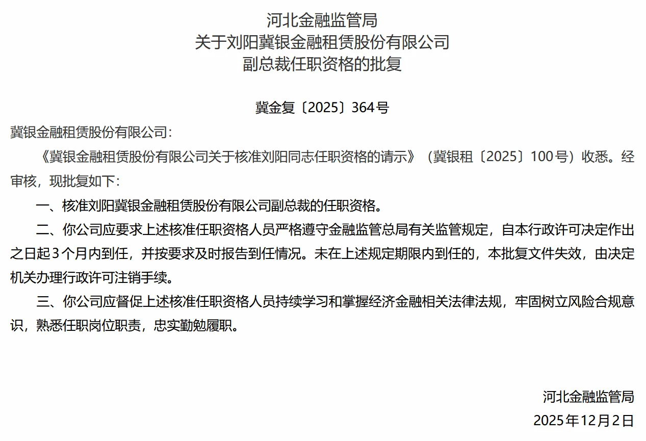 北京商报讯(记者 孟凡霞 周义力)12月8日,河北金融监管局发布《关于刘阳冀银金融租赁股份有限公 司副总裁任职资格的批复》,核准刘阳冀银金融租赁股份有限公司副总裁的任职资格。 ...