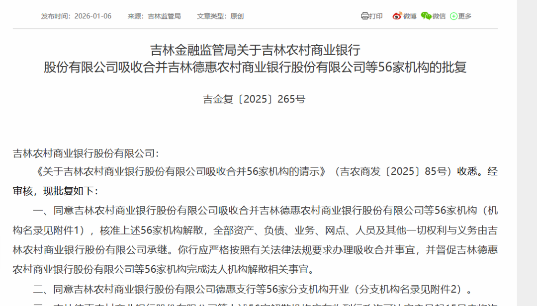 【 导读 】 吉林农商银行改革新进展,获批吸收56家村镇银行 中国基金报记者 嘉合 1月6日,吉林金融监管局批复公告称,同意吉林农村商业银行股份有限公司(以下简称吉林 农商银行)吸收省内8家农商银行及48家村镇银行,核准上述56家机构解散。 吉林省农信系统改革新进展 吉林金融监管局公告称,同意吉林农商银行吸收合并吉林德惠农商银行等56家机构,核准上 述56家机构解散,全部资产、负债、业务、网点、人员及其他一切权利与义务由吉林农商银 行承继。该行应严格按照有关法律法规要求办理吸收合并事宜,并督促吉林德惠农商银行等 56家机构完成法人机构解散相关事宜。 同时,同意吉林农商银行德惠支行等56家分支机构开业,上述56家解散机构应在收到行政许 可决定之日起15日内将许可证缴回发证机关,并按照有关法律法规办理相关手续。吉林农商 银行应就分支机构更名事项向该局属地派出机构报告,变更金融许可证。 这意味着,吉林省农信系统的"统一法人"改革迎来重要进展。业内认为,吉林农商银行通过 吸收上述56家机构,能够将分散于各区域的金融风险纳入统一管控体系,大幅降低单体机构 风险外溢的可能性。 吉林农商银行2025年刚获批成立 回顾吉林省 ...