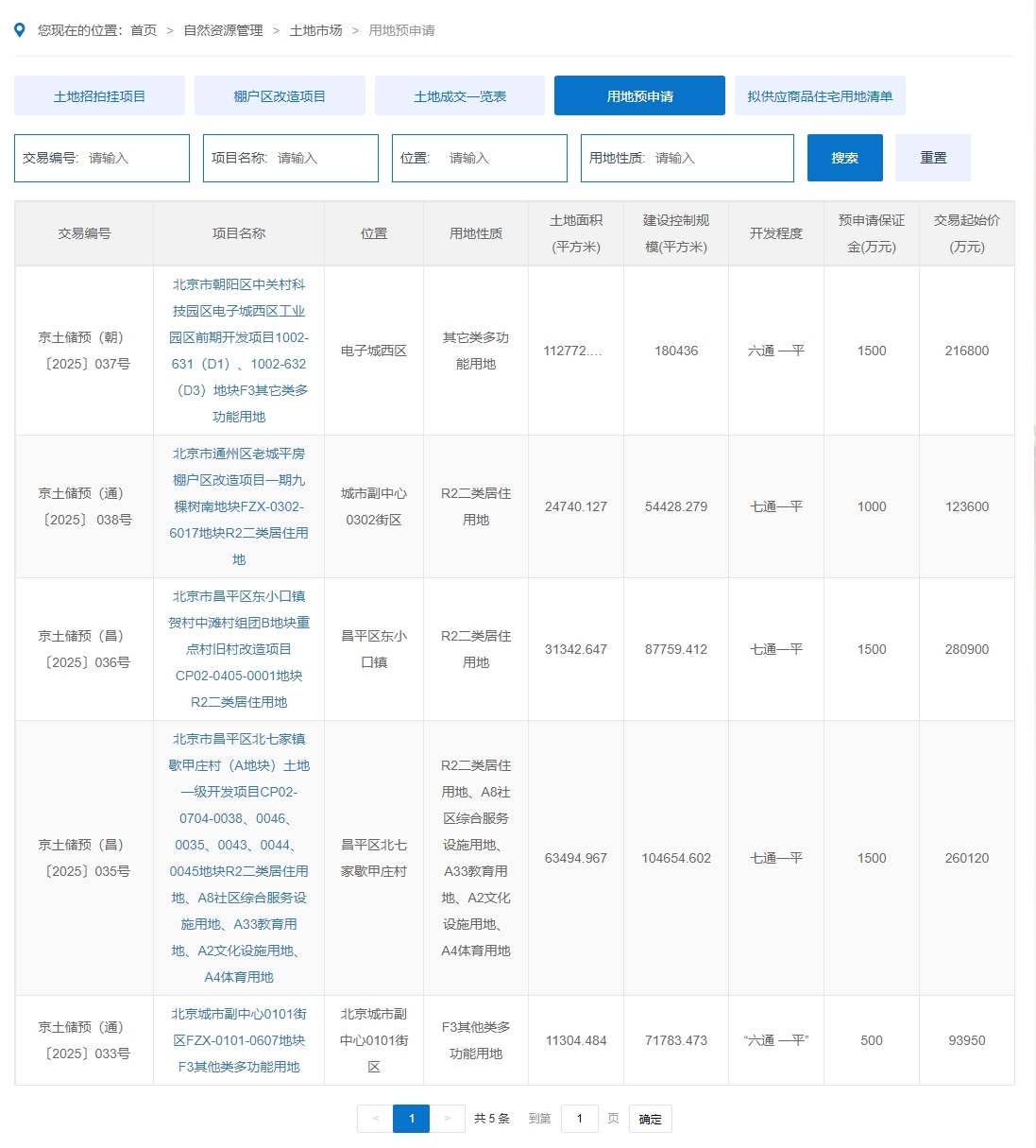 9月初,北京公布第七轮拟供应商品住宅用地清单,东城区祈年大街地块因二环核心区的位置备受关注,它也由此成为第七轮供地中首宗进入用地预申请阶 段的地块。 根据相关公告,该地块预申请受理截至时间为10月11日下午17:00。据相关媒体报道,因没有房企报名,这宗堪称"二环绝版"的宅地最终未能成功转正。不 过,也有网友称,有两家房企交了预保证金,因其他原因未获挂牌。 10月13日下午14点,在北京规自委官网用地预申请一栏中,该地块信息还在列。不过半小时后,此地块信息已被撤下。 | 土地招拍撞项目 | 棚户区改造项目 | | 土地成交一览表 | | 用地预申请 | 拟供应商品住宅用地清单 | | | | --- | --- | --- | --- | --- | --- | --- | --- | --- | | 交易编号: 请输入 | 项目名称: 请输入 | | 位置: 请输入 | | 用地性质: 请输入 | 捜索 | | 重置 | | 交易编号 | 项目名称 | 位置 | 用地性质 | 土地面积 (平方米) | 建设控制规 模(平方米) | 开发程度 | 预申请保证 金(万元) | 交易起始价 (万元) | | 京土 ...