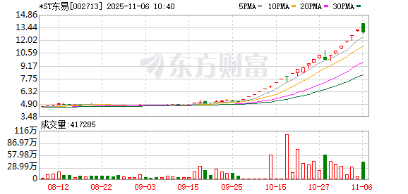 *ST东易再度涨停,23个交易日内录得18个涨停,累计涨幅为167.70%,累计换手率为153.53%。截至 9:25,该股今日成交量72.91万股,成交金额1009.02万元,换手率0.18%。最新A股总市值达58.06亿元, A股流通市值56.95亿元。 | 日期 | 当日涨跌幅(%) | 换手率(%) | 主力资金净流入(万元) | | --- | --- | --- | --- | | 2025.11.05 | 5.02 | 1.78 | 595.55 | | 2025.11.04 | 5.02 | 7.58 | -5367.74 | | 2025.11.03 | 5.01 | 2.92 | -1511.86 | | 2025.10.31 | 4.98 | 7.87 | -2541.67 | | 2025.10.30 | 5.04 | 9.11 | -4930.61 | | 2025.10.29 | 4.98 | 10.62 | -1685.75 | | 2025.10.28 | -5.02 | 14.45 | -10044.39 | | 2025.10.27 | 4.97 | 5.32 | -142 ...
