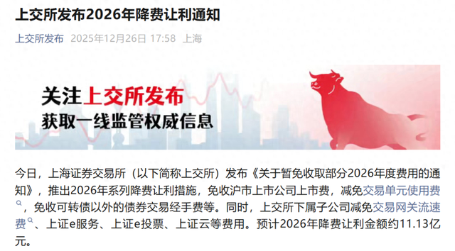 沪深交易所,重磅消息来了! 12月26日,上交所、深交所均发布通知,公布2026年度系列降费措施。 其中,上交所预计2026年降费让利金额约11.13亿元,深交所预计整体降费金额超过8亿元。也即,两大 交易所预计降费总金额将超过19亿元。降费内容涉及股票、基金、债券等品种,覆盖上市、交易、服务 等环节,为股民切实"送福利"。 具体而言,上交所发布《关于暂免收取部分2026年度费用的通知》,推出2026年系列降费让利措施,免 收沪市上市公司上市费,减免交易单元使用费,免收可转债以外的债券交易经手费等。同时,上交所下 属子公司减免交易网关流速费、上证e服务、上证e投票、上证云等费用。 上交所提到,其始终认真贯彻落实党中央和国务院关于减税降费的决策部署,持续挖掘降费空间,提升 让利力度,聚焦支持实体经济发展,推动资本市场高质量发展。"十四五"期间,上交所研究调降股票、 债券、基金、REITs等的交易经手费收费标准,持续免收上市公司及基金、REITs上市费,减免会员等 市场主体的交易单元使用费;上交所下属子公司持续减免上市公司、行业机构相关服务费用,通过系列 降费措施提振市场信心、稳定发展预期,助力经济平稳健康运行。 ...