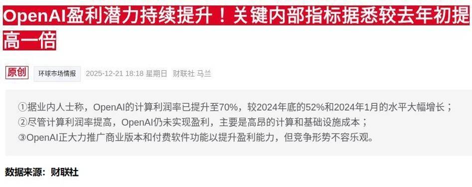1.【MiniMax稀宇科技副总裁薛子钊:全球仅四家公司在三模态均达到领先水平】MiniMax稀宇科技 副总裁薛子钊表示,目前全球仅四家公司在语言、视觉、声音三个模态均有全球领先模型,分别是 OpenAI、谷歌、MiniMax和字节跳动。公司相信国内大模型公司被严重低估,未来将提供更高性价 比的智能服务。(新浪科技) 4.【报道称OpenAI今年付费产品的计算利润率提高】据报道,OpenAI努力保持其在人工智能领域领 先地位的同时,今年付费产品利润率有所提高。据报道,OpenAI提高了其"计算利润率",这一内部 指标为扣除为企业和消费者产品付费用户运行模型的成本后收入所占比例。报道援引一位知情人士 称,截至10月OpenAI的计算利润率达到70%,高于2024年底的52%,是2024年1月的两倍。 OpenAI的发言人表示,公司没有公布这些数据,并拒绝进一步置评。(界面新闻) 更多AIGC资讯…… 扫码可订阅产业日报 2.【千问App发布2025十大AI提示词,股票位列榜首】12月22日,千问App发布"2025十大AI提示 词"榜单,揭示了2025年人们使用AI的十大高频场景,其中问得最多的三类问题为股票、 ...