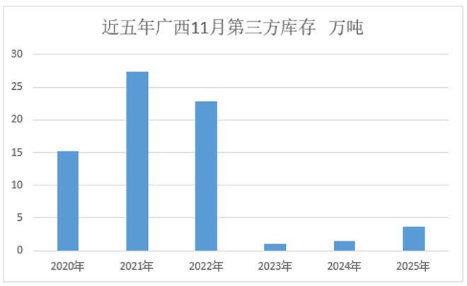 行业核心观点 - 截至11月末,广西与云南两地食糖第三方累计库存为16.85万吨,同比大幅增加10.66万吨,主要因北方新榨季生产提速及南方开榨导致新糖阶段性供应增加 [4] - 尽管库存同比显著增加,但与近五年历史均值相比,两地库存水平仍处于偏低或中性偏多状态,显示当前供应压力相对有限 [1][3] - 由于广西大部分糖厂开榨时间晚于预期且已开榨糖厂以交付预售糖为主,市场现货供应有限,叠加两地集中开榨在12月,预计在大量新糖上市前销售压力不大 [4] 广西地区库存分析 - 截至11月末,广西第三方库存为3.06万吨,同比增加1.64万吨 [1] - 当前库存水平与近五年广西11月末第三方库存均值13.59万吨相比,仍处于偏低状态 [1] 云南地区库存分析 - 截至11月末,云南第三方库存为13.79万吨,同比大幅增加9.02万吨 [3] - 当前库存水平与五年来云南11月末库存均值19.26万吨相比,数据呈中性偏多 [3] 库存变动原因与市场影响 - 广西、云南两地累计库存同比增加10.66万吨,主要驱动因素为北方新榨季生产提速,以及广西、云南开榨后新糖陆续上市 [4] - 广西大部分糖厂开榨时间比预期晚,且已开榨糖厂主要精力用于兑现前期预售糖,导致当前市场现货供应有限 [4] - 鉴于广西、云南集中开榨时间在12月,在大量新糖上市之前,两地销售压力预计不大 [4]