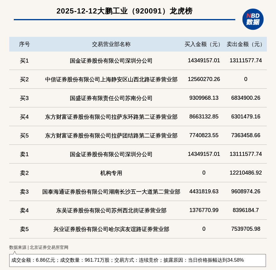 公司股价异动与龙虎榜数据 - 北交所上市公司大鹏工业(920091)于2025年12月12日因价格振幅达到34.58%登上龙虎榜 [1] - 当日成交数量为961.71万股,成交金额为6.86亿元 [1] - 交易方式为连续竞价 [1] 龙虎榜买卖席位详情 - 买入金额排名第一的席位为国金证券股份有限公司深圳分公司,买入1434.92万元 [1][2] - 卖出金额排名第一的席位同样为国金证券股份有限公司深圳分公司,卖出1311.16万元 [1][2] - 机构专用席位出现在卖方第二位,卖出1221.05万元 [2] - 买入金额排名第二的席位为中信证券股份有限公司上海静安区山西北路证券营业部,买入1256.03万元 [2] - 买入金额排名第三的席位为国盛证券有限责任公司苏南分公司,买入931.00万元 [2]