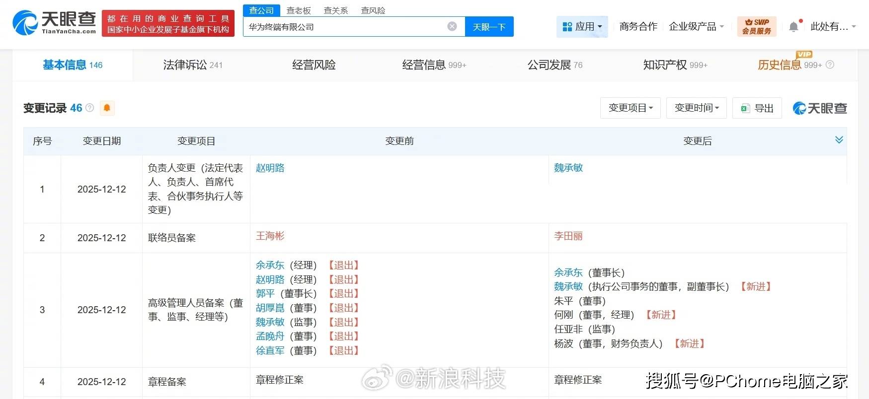 | 爱企查App显示,近日,华为终端有限公司发生工商变更,郭平卸任董事长,由余承东接任,孟晚舟、徐直军等卸任董事,同时,多位高管发生变更。 | | --- | | ○ 爰企查 专业查理 印度企业就上爱 | | 查企业 ▼ 华为终端有限公司 | | × 蒼一下 | | 应用▼| ◎ 老户特惠 | 供需集市| 日APF _ | HOT | | | --- | --- | --- | --- | --- | --- | --- | --- | --- | | 基本信息 383 | | 司法信息 628 | 经营诊断 999+ | 知识产权 999+ | 企业发展 23 | 经营状况 999+ | | 于中信息 872 | | 变更记录 27 Q发生变更时提醒我 | | | | | | 变更项目 √ | 业 下载数据 | ◎ 農企查 | | 序号 | 变更日期 | 变更项目 | | 变更前 | | 变更后 | | | | 1 | 2025-12-12 | 负责人变更(法定代表 人、负责人、首席代表、 合伙事务执行人等变更) | 赵明路 | | | 魏承敏 | | | | 2 | 2025-12-12 | 联络员备案 ...
