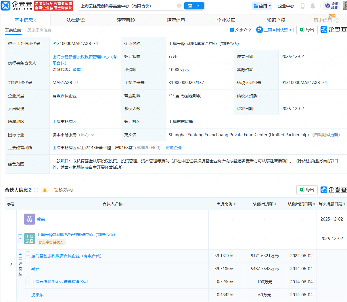 公司设立与股权结构 - 上海云锋元创私募基金中心(有限合伙)于2025年12月2日成立,出资额为1亿元人民币,登记状态为存续 [1][2] - 公司由黄鑫、马云持股的上海云锋新创股权投资管理中心(有限合伙)作为执行事务合伙人共同成立,委派代表为黄蓉 [1][2] - 公司合伙人包括厦门荟创股权投资合伙企业(有限合伙)认缴出资8171.6321万元占比59.1317%,以及上海云锋新创企业管理有限公司认缴出资100万元占比0.7236% [2][3] 公司基本信息 - 公司注册于上海市杨浦区,所属行业为资本市场服务,经营范围是以私募基金从事股权投资、投资管理、资产管理等活动 [2] - 公司营业期限为无固定期限,核准日期为2025年12月2日 [2]