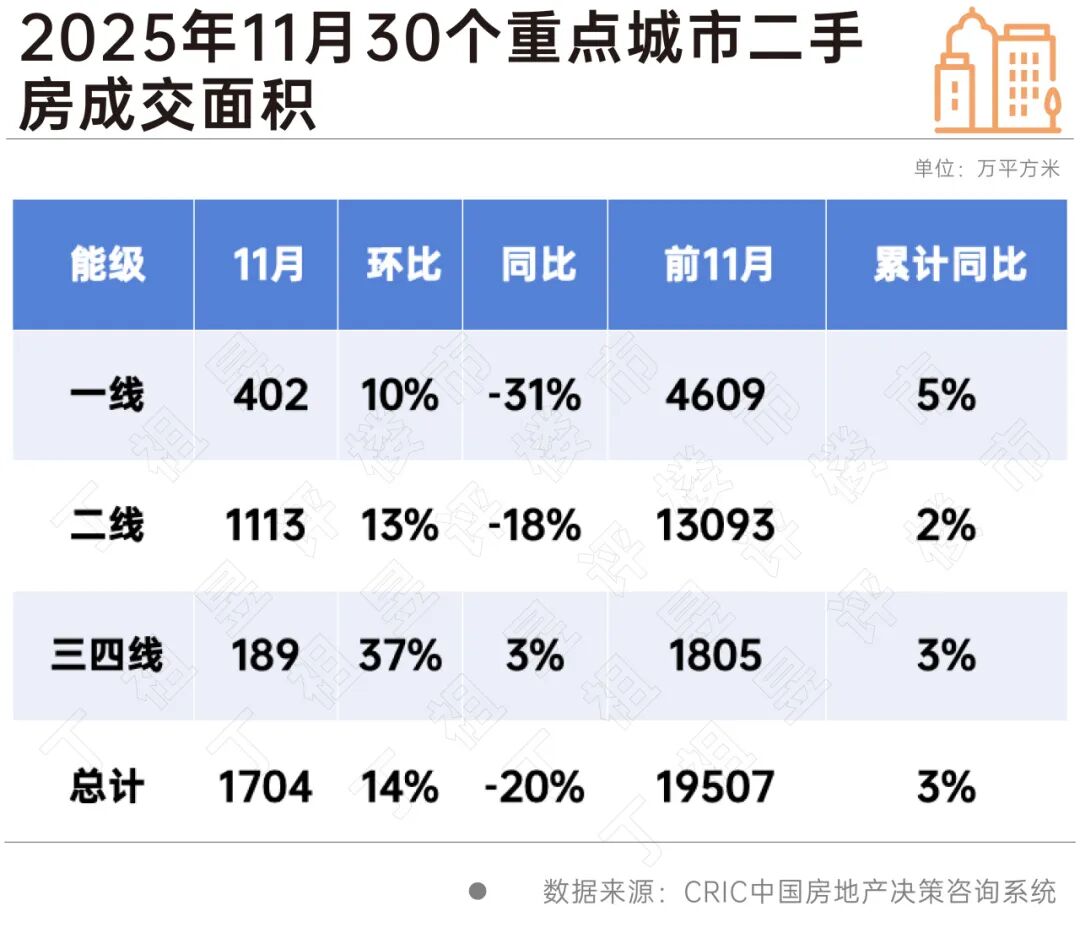 核心观点 - 2025年11月,中国30个重点城市二手房市场出现积极信号,成交面积环比显著回升,各能级城市普涨,部分城市出现房东惜售现象,这被视为对整体市场稳定的重要支撑 [1][2] 市场整体表现 - **成交量环比回升**:2025年11月,30个重点城市二手房成交面积达1704万平方米,环比上升14% [1][2] - **累计同比保持增长**:前11月30个重点城市二手房累计成交面积19507万平方米,累计同比上涨3% [2] - **各能级城市普涨**:一线城市环比上涨10%,二线城市环比上涨13%,三四线城市环比上涨37%,表明回升并非个别城市现象 [2][3] - **一二手市场联动稳定**:11月一二手成交总面积环比微增1%,部分核心城市需求稳定,对全国市场形成支撑 [9] 重点城市表现 - **多个城市环比增幅显著**:上海、成都、武汉、南京、厦门等城市二手房成交面积环比增幅均超过20% [1][4] - **成都成交量领跑**:11月成都二手房成交面积达174万平方米,环比增长24%,前11月累计同比上升13% [4][6] - **上海成交量居次**:11月上海二手房成交面积171万平方米,环比增长22%,前11月累计同比上升10% [5][6] - **其他城市表现**:北京环比增长15%,重庆环比增长12%,南京环比增长22%,长沙环比大幅增长122%,常州环比增长53%,南宁环比增长107% [6] 价格与市场行为变化 - **成交均价普遍承压**:市场仍以价换量为主旋律,11月70个大中城市二手房房价下跌幅度大于商品住宅 [2][6] - **上海均价降幅收窄**:11月上海全市二手房成交均价35399元/平方米,环比微降1.54%,且降幅较10月有所收窄 [5] - **成都新房价格分化**:11月大成都区域新房住宅认购均价约20117元/平方米,环比下降约4.78%,24个区域中11个环比上涨,13个下降 [5] - **出现惜售现象**:部分城市,尤其是上海,部分房东选择变售为租,核心区位“老破小”挂牌量出现下降,买卖双方心态博弈加剧 [1][5] 市场分析参考指标 - **租赁回报率成为参考**:以租赁回报率是否达到2%作为价格评估参考指标,不足2%则价格仍有下行空间,达到2.5%为优质资产,达到3%基本可以入手 [7] - **与存款利率对比**:当前五年期存款整存利率已低于1.8%,部分银行年末揽储活动下三年期利率可达1.9%,但仍低于2% [7] - **惜售行为与租赁回报率相关**:近期部分城市房东变售为租与租赁回报率的提升有较大关系 [7]