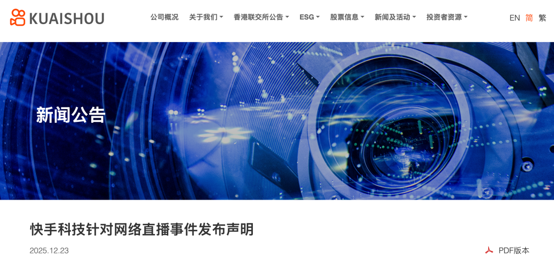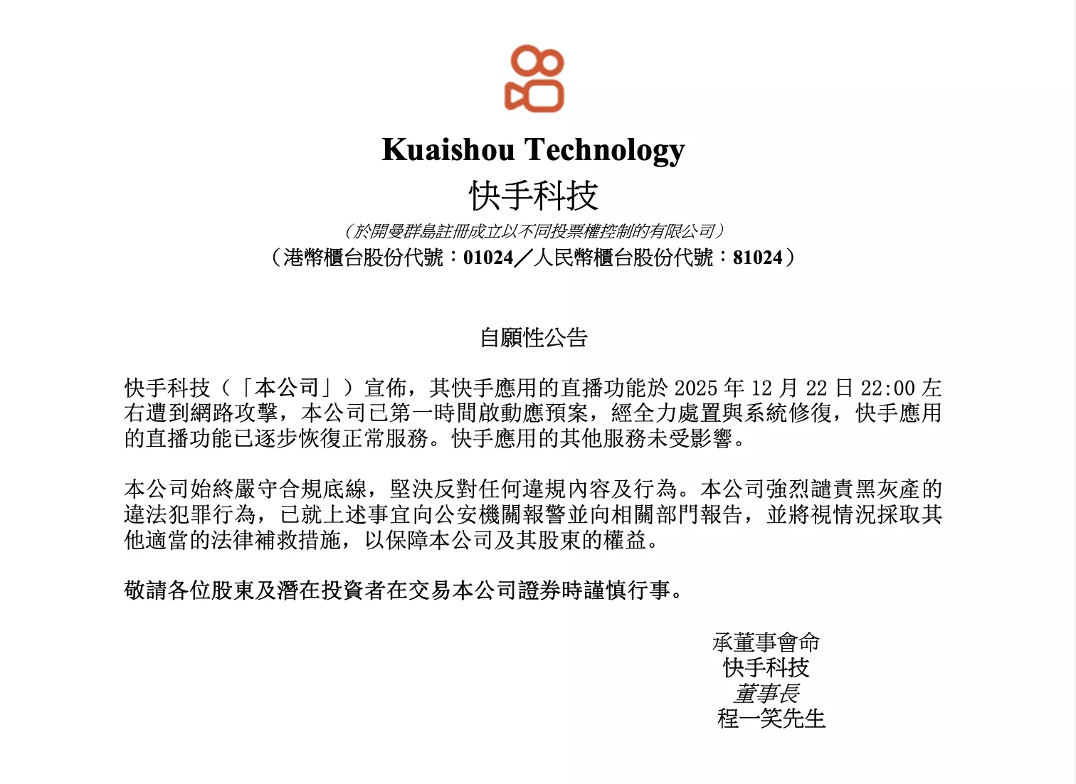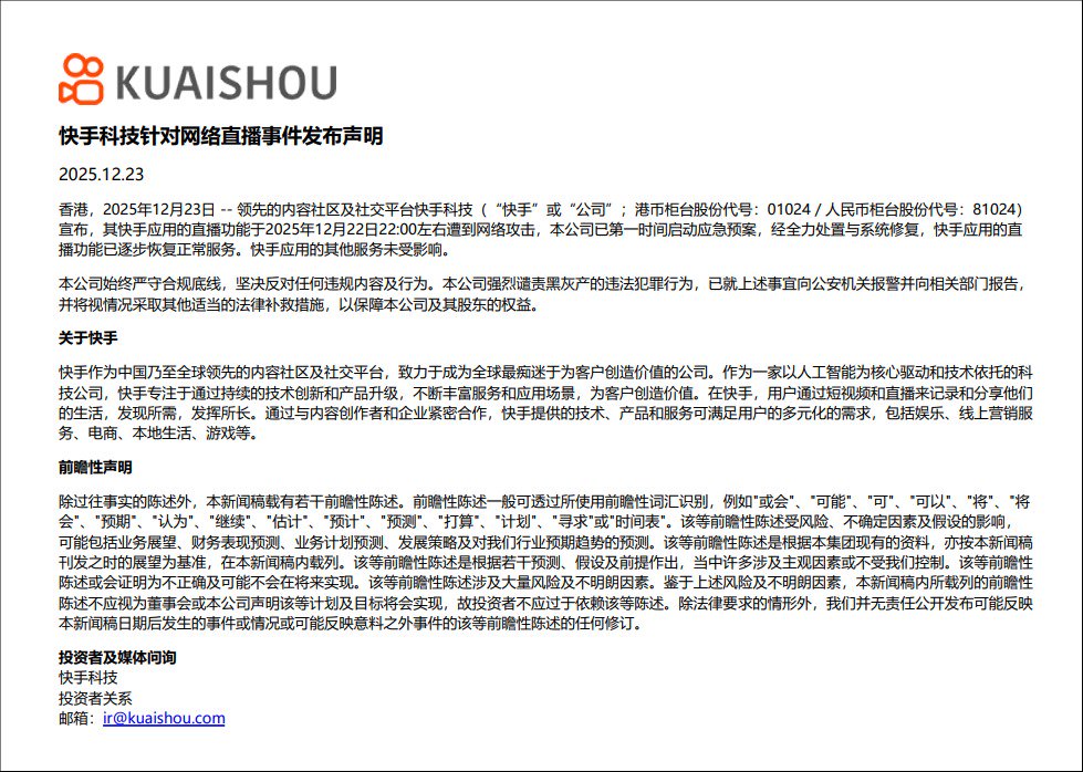 12月23日消息,快手针对网络直播事件发布声明称:快手应用的直播功能于2025年12月22日22:00左右巡到网络攻击,本公司已第一时间启动应急预案,经 全力处置与系统修复,快手应用的直播功能已逐步恢复正常服务。快手应用的其他服务未受影响。 公告显示,本公司始终严守合规底线,坚决反对任何违规内容及行为。本公司强烈谴责黑灰产的违法犯罪行为,已就上述事宜向公安机关报警并向相关部门 报告并将视情况采取其他适当的法律补救措施,以保障本公司及其股东的权益。 ...