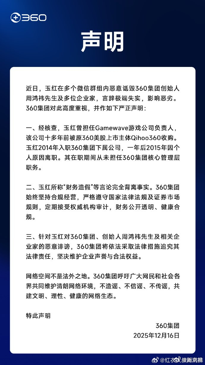 【#周鸿祎回应前高管指控360财务造假#】#周鸿祎发布声明# 12月17日,@红衣大叔周鸿祎 微博发文: 近日,玉红在多个微信群组内恶意诋毁360集团创始人周鸿祎先生及多位企业家,言辞极端失实,影响 恶劣。360集团对此高度重视,并作如下严正声明: 一、经核查,玉红曾担任Gamewave游戏公司负责人,该公司十多年前被原360美股上市主体Qihoo360收 购。玉红2014年入职360集团下属公司,一年后2015年因个人原因离职。其在职期间从未担任360集团核 心管理层职务。 二、玉红所称"财务造假"等言论完全背离事实。360集团始终坚持合规经营,严格遵守国家法律法规及 证券市场规则,定期接受权威机构审计,财务公开透明、健康合规。 三、针对玉红对360集团、创始人周鸿祎先生及相关企业家的恶意诽谤,360集团将依法采取法律措施追 究其法律责任,坚决维护企业声誉与合法权益。 网络空间不是法外之地。360集团呼吁广大网民和社会各界共同维护清朗网络环境,不造谣、不信谣、 不传谣,共建文明、理性、健康的网络生态。 规。 三、针对玉红对360集团、创始人周鸿祎先生及相关企 业家的恶意诽谤,360集团将依法采取法律措施追究 ...