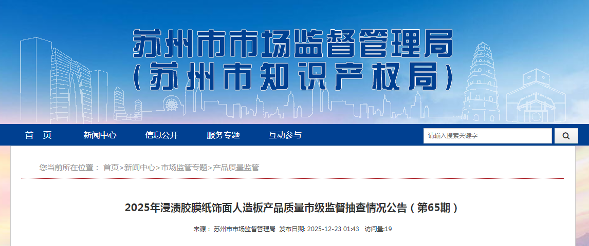 苏州市市场监督管理局发布2025年浸渍胶膜纸饰面人造板产品质量市级监督抽查情况公告(第65期)