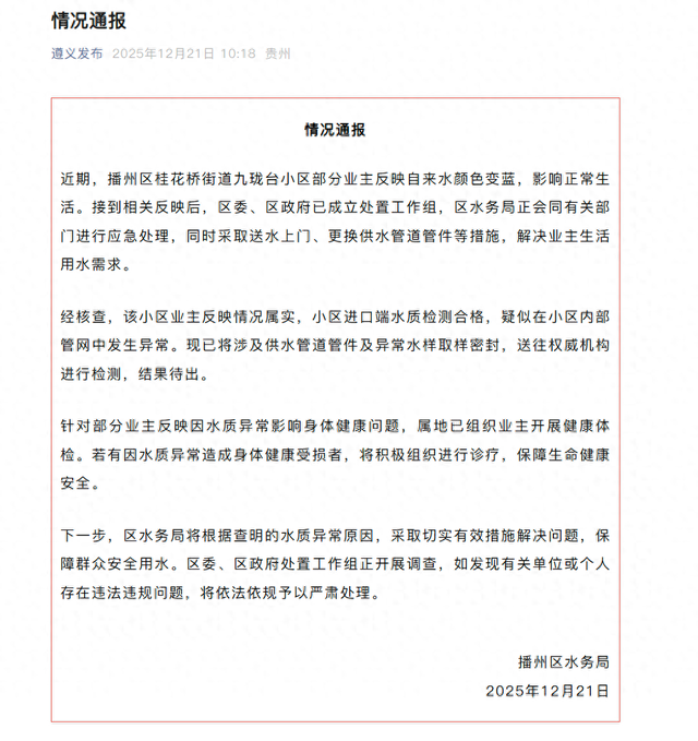 贵州省遵义市播州区水务局12月21日通报,近期,播州区桂花桥街道九珑台小区部分业主反映自来水颜 色变蓝,影响正常生活。接到相关反映后,区委、区政府已成立处置工作组,区水务局正会同有关部门 进行应急处理,同时采取送水上门、更换供水管道管件等措施,解决业主生活用水需求。 经核查,该小区业主反映情况属实,小区进口端水质检测合格,疑似在小区内部管网中发生异常。现已 将涉及供水管道管件及异常水样取样密封,送往权威机构进行检测,结果待出。 针对部分业主反映因水质异常影响身体健康问题,属地已组织业主开展健康体检。若有因水质异常造成 身体健康受损者,将积极组织进行诊疗,保障生命健康安全。 下一步,区水务局将根据查明的水质异常原因,采取切实有效措施解决问题,保障群众安全用水。区 委、区政府处置工作组正开展调查,如发现有关单位或个人存在违法违规问题,将依法依规予以严肃处 理。 此前据大风新闻报道,居民反映贵州省遵义市播州区九珑台小区自来水"蓝得看不到底",更换管道后发 现大量固体蓝色堆积,业主体检后有人肺部出现问题。 今年4月小区自来水开始变蓝 一直持续到11月底 王先生是贵州省遵义市播州区九珑台小区的业主,他说,房子是2024 ...