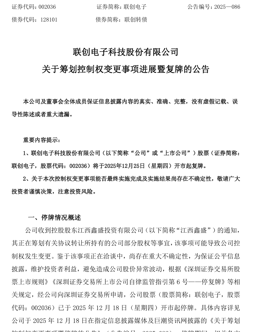 周四复牌!002036,地方国资拟入主