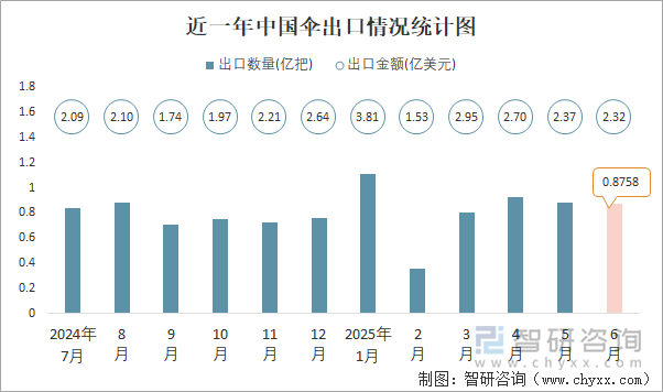 2025年6月中国伞出口数量和出口金额分别为0.88亿把和2.32亿美元