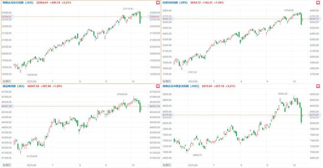 纳斯达克中国金龙指数收涨3.21%,热门中概股普涨,世纪互联涨超10%,蔚来涨近7%,名创优品涨超 5%,阿里巴巴、京东涨超4%,小鹏汽车、百度涨超3%。 格隆汇10月14日|美股三大指数集体收涨,道指涨1.29%,纳指涨2.21%,标普500指数涨1.56%,热门 科技股普涨,博通涨超9%,特斯拉、甲骨文涨超5%,谷歌涨超3%,英伟达涨超2%。加密矿企、贵金 属、半导体涨幅居前,Bitfarms涨超28%,纳微半导体涨超21%,Arm涨超11%,美光科技、泛美白银涨 超6%,高通涨超5%。烟草食品、减肥药板块走低,Beyond Meat跌超48%,通用磨坊跌超2%,礼来跌 超1%。 ...