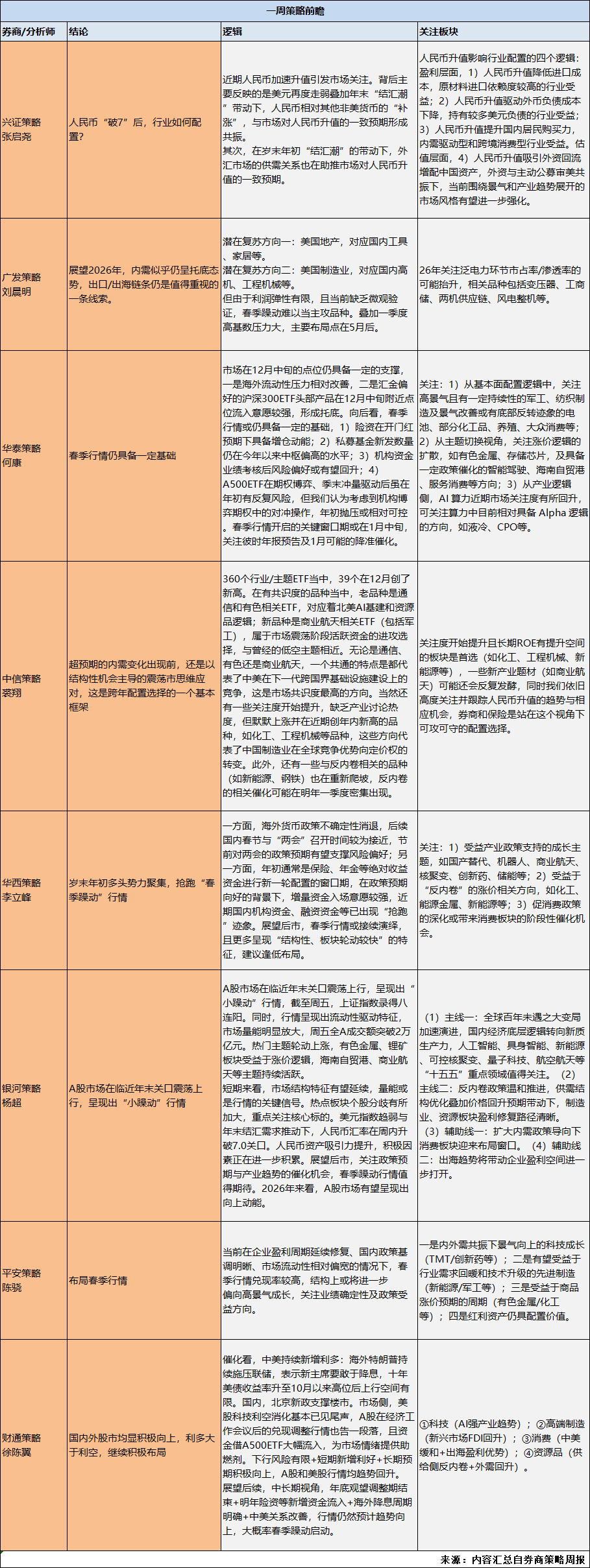 华西策略李立峰团队称,岁末年初多头势力聚集,"春季躁动"行情有望抢跑。一方面,海外货币政策不确定性消退,后续国内春 节与"两会"召开时间较为接近,节前对两会的政策预期有望支撑风险偏好;另一方面,年初通常是保险、年金等绝对收益资金进 行新一轮配置的窗口期,在政策预期向好的背景下,增量资金入场意愿较强,近期国内机构资金、融资资金等已出现"抢跑"迹 象。 本周各家券商策略分析师整体依旧保持乐观。 | | 一周策略前瞻 | | | | --- | --- | --- | --- | | 芬商/分析师 结论 | 逻辑 | | 关注板块 | | 兴证策略 张启尧 言? | 要反映的是美元再度走弱叠加年末"结汇潮 人民币"破7"后,行业如何配 | | 人民币升值影响行业配置的四个逻辑: 盈利层面,1)人民币升值降低进口成 3)人民币升值提升国内居民购买力, | | | 近期人民币加速升值引发市场关注。背后主 | | | | | | | 本,原材料进口依赖度较高的行业受 | | | | | 益;2)人民币升值驱动外币负债成本 | | | " 带动下,人民币相对其他非美货币的"补 | | 下降,持有较多美元负债的行业受益; | ...