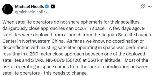 【文/观察者网 心智研究所】 12月12日深夜,SpaceX星链工程副总裁迈克尔·尼科尔斯在社交平台X上发布了一条措辞严厉的声明, 指控中国发射的卫星与星链卫星发生了"危险的近距离接近",距离仅有200米。这条消息迅速引爆舆 论,在中美高科技竞争日趋白热化的背景下,这起发生在560公里高空的"擦肩而过",折射出的远不止 轨道安全那么简单。 然而,当我们拨开舆论的迷雾,深入审视这起事件的来龙去脉,会发现事情远比表面呈现得更为复杂, 而那个看似理直气壮的指责者,自身也并非毫无瑕疵。 48小时:一个被刻意模糊的时间节点 尼科尔斯在声明中称,中方卫星在发射部署时"未与在轨运行的现有卫星进行协调或避让"。这一措辞巧 妙地将责任锁定在发射环节,暗示中国航天机构在发射前就存在疏忽。然而,中科宇航随后的回应揭示 了一个关键事实:这次近距离接近发生在有效载荷分离后约48小时,彼时发射任务早已结束。 这意味着什么?火箭的职责是将卫星送入预定轨道,一旦完成分离,后续的轨道运行便归卫星运营商管 理。中科宇航在回应中明确表示,所有力箭一号的发射都会使用地面空间感知系统选择发射窗口,以避 免与已知卫星和碎片发生碰撞——这是强制性程序。换 ...