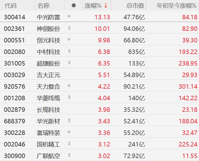 格隆汇12月23日|A股市场商业航天股继续走强,其中,中光防雷(300414)涨超13%,神剑股份(002361) (4连板)、创元科技(2连板)10CM涨停,中材科技(002080)、超捷股份涨超6%,吉大正元涨超5%。消息 面上,由中国航天科技(000901)集团八院抓总研制的长征十二号甲(CZ - 12A)可重复使用运载火箭,计 划于今日上午执行首飞任务。此外,2025第三届商业航天发展(000547)大会暨第四届中关村(000931)商 业航天大会定于2025年12月24日在北京举行。 | 代码 | 名称 | . | 涨幅% ↓ | 总市值 | 年初至今涨幅% | | --- | --- | --- | --- | --- | --- | | 300414 | 中光防雷 | | 13.13 | 47.76亿 | 84.18 | | 002361 | 神剑股份 | 文 | 10.01 | 94.06亿 | 82.90 | | 000551 | 创元科技 | -澳 | 9.98 | 66.80亿 | 39.30 | | 002080 | 中材科技 | 4 | 6.38 | 635亿 | 193.22 | ...
