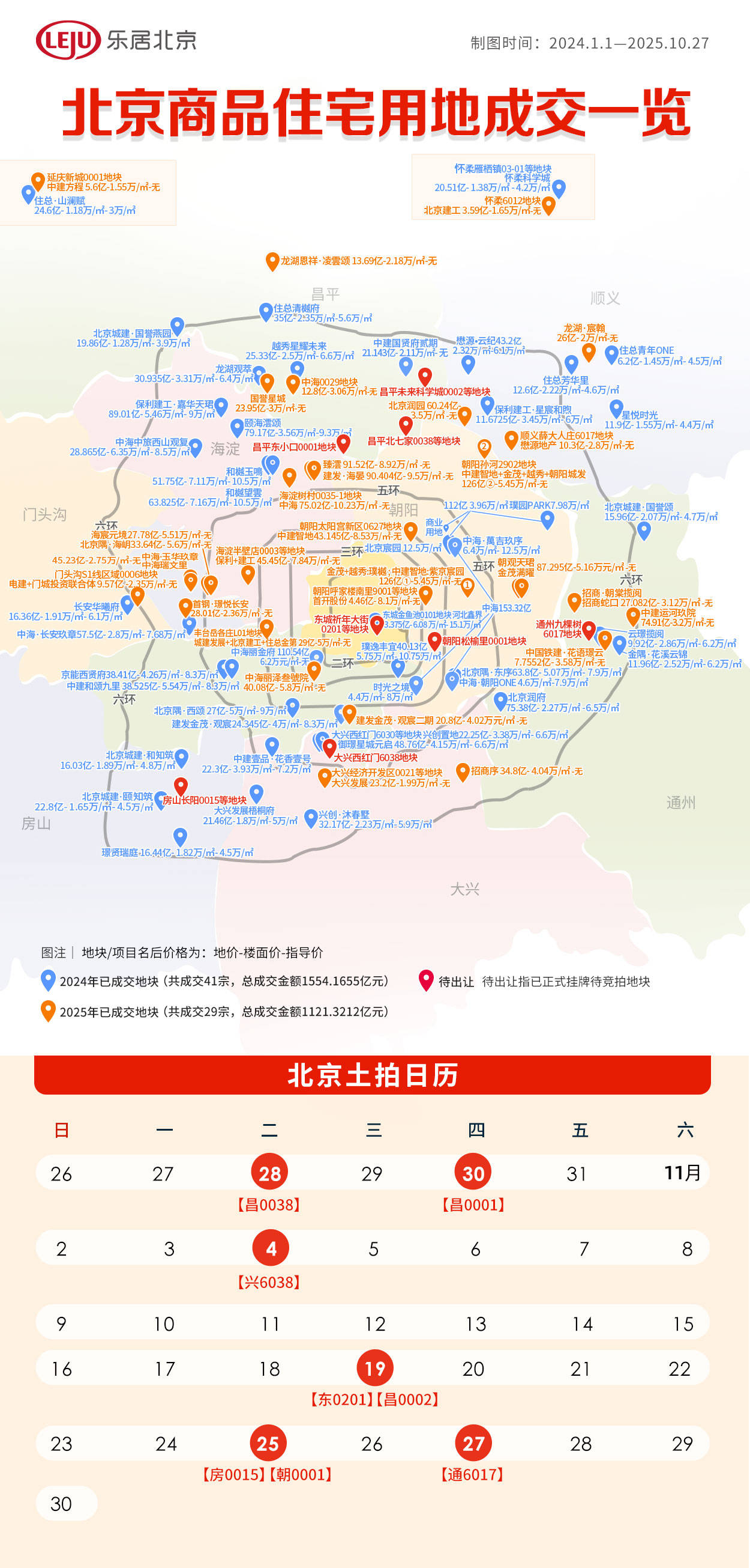 2025年最后2个月,北京土地供应进入密集期。截至10月28日,累计8宗住宅用地待出让,包含昌平歇甲、昌平东小口、大兴西红门、东城祈年大街、昌平未 来科学城、房山广阳城、朝阳松榆里、以及通州九棵树地块,具体竞拍日期如下: | 日 | | | 北京土拍日历 = | 四 | 五 | | --- | --- | --- | --- | --- | --- | | 26 | 27 | 28 | 29 | 30 | 31 | | | | 【昌0038】 | | 【昌0001】 | | | 2 | 3 | 4 | 5 | 6 | 7 | | | | 【兴6038】 | | | | | 9 | 10 | 11 | 12 | 13 | 14 | | । ୧ | 17 | 18 | 19 | 20 | 21 | | | | | 【东0201】【昌0002】 | | | | 23 | 24 | 25 | 26 | 27 | 28 | | 30 | | 【房0015】【朝0001】 | | 【通6017】 | | 其中,本周昌平将有2宗住宅用地成交。其中,昌平区北七家镇歇甲庄村(A地块)土地一级开发项目CP02-0704-0038 ...