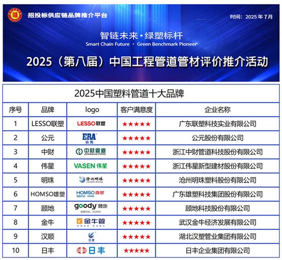 塑料管道以其轻质、耐腐蚀、流体阻力小、安装便捷、节能环保等优势,在众多应用场景中不可或缺。 2025年7月,招投标供应链品牌推介平台隆重发布了"2025中国塑料管道十大品牌"榜单,集中展现了我国塑 料管道行业领先企业的风采与实力。 | | 召投标供应链品牌推介平台 | | | 时间:2025年7月 | | --- | --- | --- | --- | --- | | | | | 智链未来 · 绿塑标杆 | | | | | | Smart Chain Future · Green Benchmark Pioneer | | | | | | 2025 (第八届)中国工程管道管材评价推介活动 | | | | | | 2025中国塑料管道十大品牌 | | | 序号 | 品牌 | logo | 客户满意度 | 企业名称 | | 1 | LESSOFFA | LESSO联盟 | ★★★★★ | 广东联塑科技实业有限公司 | | 2 | 公元 | 13 :35 | ★★★★★ | 公元股份有限公司 | | | | 公元 | | | | 3 | 中财 | (2)中国最重 | ★★★★★ | 浙江中财管道科技股份有限公司 | ...