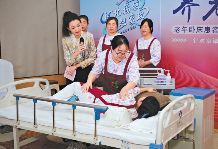 现场的工作人员正在演示养老照护。 陈颖齐摄 本报记者 李如意 实习生 陈颖齐 长期卧床的老人如何照料?新生儿吃奶后如何正确拍嗝?针对"一老一小"的照护需求,在12月19日举办 的"河北福嫂·燕赵家政"品牌推介会上,"福嫂"们向大家展示了专业的技能技巧。会上,多家家政服务 机构与北京、天津的机构签约,将定期输送专业"福嫂"。 "河北福嫂·燕赵家政"工作已连续5年被纳入河北省委、省政府20项民生工程。多年来,河北省妇联带动 23万名妇女就业,为100多万家庭提供了优质服务。目前,约15.3万名"河北福嫂"活跃在京津市场,其 中北京12.3万人、天津3万人,在北京、天津家政服务人员中占比分别达到39.6%和22.7%,成为服务京 津市民生活、保障城市运行的一支重要力量。 家政服务更加专业综合 "当时我的工作是照顾宝妈和一个三斤六两的早产儿诺诺。"提到此前一次在北京入户服务的经历,"河 北福嫂"赵玉静记忆犹新。赵玉静是河北定州人,2021年进入家政服务行业,积累了丰富的母婴护理经 验。面对这个年幼的小生命,赵玉静比平时更加认真、细心,为诺诺做好抚触,使用早产儿奶瓶喂奶, 尽心尽力为诺诺增重,同时每天记录体温、吃奶量、 ...