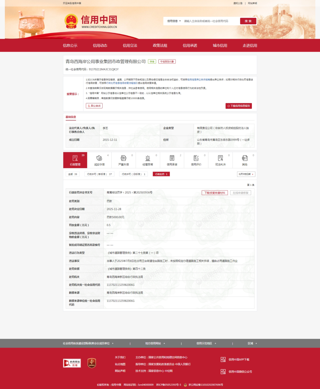 道路施工作业。 对此,处罚机关依据《城市道路管理条例》第四十二条,对其罚款0.5万元。行政处罚决定书文号:青黄综法罚字﹝2025﹞第202503936号。 齐鲁晚报·齐鲁壹点记者于信用中国行政处罚栏获悉,11月28日,青岛西海岸公用事业集团市政管理有限公司(下称"西海岸公用集团市政公司")因"擅自 占用道路施工作业"等收到罚单,处罚机关为青岛西海岸新区综合行政执法局。 内容显示,西海岸公用集团市政公司的违法事实是:当事人于2025年7月8日在占用王台街道佳台路施工时,未按照规定办理道路施工相关手续,擅自占用 据西海岸公用集团官网介绍,西海岸公用集团市政公司是青岛西海岸公用事业集团下属全资子公司,主营业务为环卫保洁、垃圾清运、市政养护、园林绿 化养护、路灯施工管理等,是全国为数不多的集环卫保洁、市政养护、园林绿化管理于一体的综合性大型区属国有企业。 西海岸公用集团则是西海岸新区涉及公用事业领域最多的专业化国有集团公司,主要承担西海岸新区供热、供水、排水、市政、园林、环卫、智慧城市和 全区一个停车场等市政基础设施建设、运营、服务,以及施工总承包、砂石土资源处置、水环境治理等。 国家企业信用信息公示系统显示,青岛西 ...