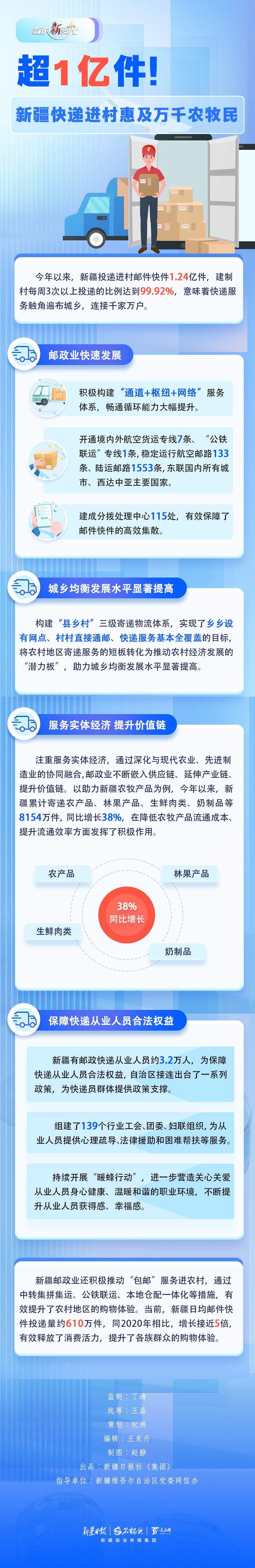 转自:天山网 邮政业快速发展 今年以来,新疆投递进村邮件快件1.24亿件,建制村每周3次以上投递的比例达到99.92%。亮眼数据的背后,新疆 邮政业做出了怎样的努力? 今天的《数说"新"变化》一起来看看。 积极构建"通道+枢纽+网络"服务 体系,畅通循环能力大幅提升。 注重服务实体经济,通过深化与现代农业、先进制 造业的协同融合,邮政业不断嵌入供应链、延伸产业链、 提升价值链。以助力新疆农牧产品为例,今年以来,新 疆累计寄递农产品、林果产品、生鲜肉类、奶制品等 8154万件,同比增长38%,在降低农牧产品流通成本、 提升流通效率方面发挥了积极作用。 农产品 林果产品 38% 同比增长 生鲜肉类 奶制 量 - F 保障快递从业人员合法权益 新疆有邮政快递从业人员约3.2万人,为保障 快递从业人员合法权益,自治区接连出台了一系列 政策,为快递员群体提供政策支撑。 组建了139个行业工会、团委、妇联组织,为从 业人员提供心理疏导、法律援助和困难帮扶等服务。 开通境内外航空货运专线7条、"公铁 联运"专线1条,稳定运行航空邮路133 条、陆运邮路1553条,东联国内所有城 市、西达中亚主要国家。 建成分拨处理中心11 ...