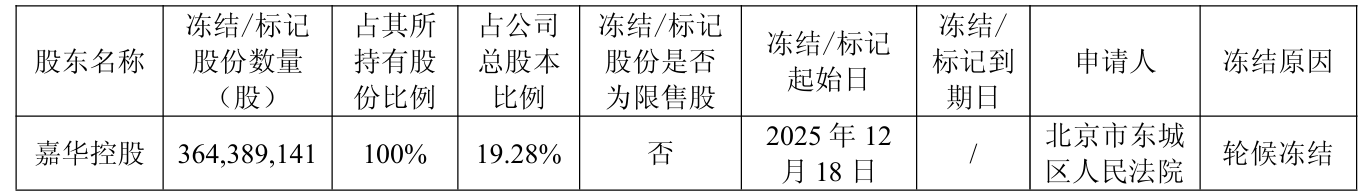 控股股东股份冻结情况 - 控股股东嘉华东方控股(集团)有限公司持有公司股份364,389,141股,占公司总股本的19.28%,本次被轮候冻结股份数量为364,389,141股,占其持股总数的100% [1] - 控股股东及其一致行动人万通投资控股股份有限公司合计持有公司股份642,511,330股,占公司总股本的33.99% [1] - 合计持股中,累计司法标记490,394,770股,累计冻结81,000,770股,合计占其持股数的88.93%,占公司总股本的30.23% [1] - 合计持股中,累计轮候冻结767,829,612股,占其合计持股数的119.50%,占公司总股本的40.62% [1] 控股股东债务与纠纷说明 - 控股股东函件告知,其与公司经营业务独立,股份冻结或标记均为借款合同纠纷,不会对公司生产经营、控制权、股权结构、公司治理等产生影响 [2] - 控股股东正在与债权方协商处理,争取尽快与各债权方达成和解 [2] - 截至公告披露日,控股股东最近一年存在债务逾期13.01亿元,因债务问题涉及的合同纠纷正在协商解决中 [2] 公司基本经营与财务表现 - 公司主营业务涉及房地产开发与销售、城市更新与运营、通信与数字科技三大板块 [3] - 2022年至2024年,公司净利润分别亏损3.23亿元、3.90亿元、4.57亿元,累计亏损超11亿元 [3] - 今年前三季度,公司营业收入为3.17亿元,同比下降4.37% [4] - 今年前三季度,公司归母净利润为-1980.02万元,同比增长82.94%;扣非归母净利润为-1.21亿元,同比增长8.04% [4] 公司近期股价表现 - 公司近一年内累计涨幅超过98%,11月26日及27日出现两个交易日连续涨停 [4] - 市场情绪在12月出现明显降温,截至12月19日收盘,公司最新股价报12.00元/股,公司总市值226.85亿元 [4]