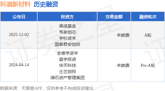 数据来源:天眼查APP 以上内容为证券之星据公开信息整理,由AI算法生成(网信算备310104345710301240019号),不构成 投资建议。 科谟(浙江)新材料科技有限公司,自2021年10月创立以来,便致力于新材料技术的深度研发与创新。 作为业界领先的新材料研发商,科谟新材不仅专注于新材料技术的研发,更在合成材料、表面功能材 料、新型膜材料以及电子专用材料等多个领域展开销售业务。 证券之星消息,根据天眼查APP于12月2日公布的信息整理,科谟(浙江)新材料科技有限公司A轮融 资,融资额未披露,参与投资的机构包括渠成基金,韦豪创芯,宇杉资本,国泰君安创投。 | 公布日 | 投资方 | 交易金额 | 融资轮次 | | --- | --- | --- | --- | | 2025-12-02 | 渠成基金 韦蒙创心 | 未披露 | A轮 | | | 宇杉资本 | | | | | 国泰君安创投 | | | | 2024-04-14 | 全德学资本 华天科技 | 未披露 | Pre-A轮 | | | 盛宇投资 | | | | | 士兰创投 | | | | | 清石资产管理集团 | | | ...