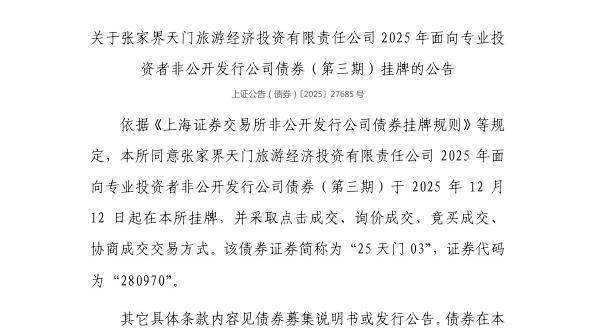 债券发行与挂牌 - 张家界天门旅游经济投资有限责任公司将于2025年面向专业投资者非公开发行公司债券(第三期)[1] - 该期债券简称为“25天门03”,证券代码为“280970”[2] - 债券将于2025年12月12日在上海证券交易所正式挂牌交易[2] 交易安排 - 债券挂牌交易将采取点击成交、询价成交、竞买成交、协商成交等多种交易方式[2] - 此次债券发行与挂牌依据《上海证券交易所非公开发行公司债券挂牌规则》等相关规定执行[2]
