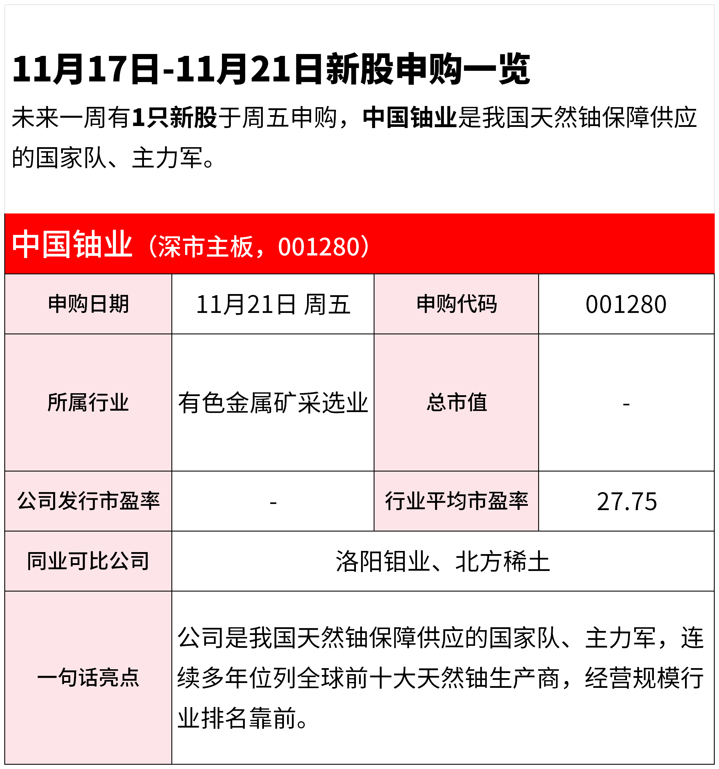新股申购信息 - 未来一周有1只新股于周五申购 [1] - 申购日期为11月21日 [2] 公司基本信息 - 公司名称为中国钠业 [2] - 上市地点为深圳证券交易所主板 [2] - 股票代码为001 [2] - 所属行业为有色金属矿采选业 [2]