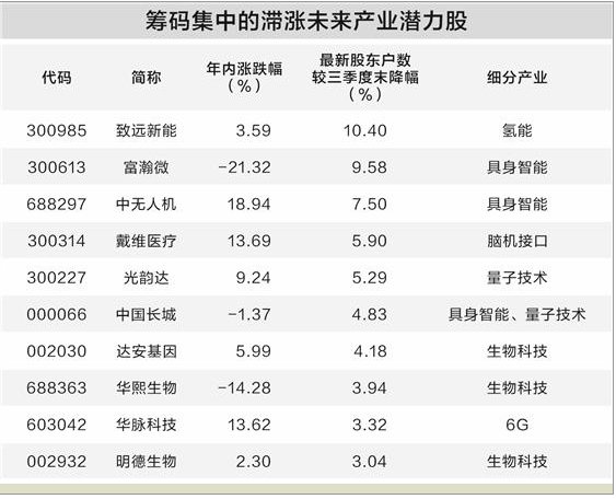 未来产业政策与市场关注 - “十五五”规划建议提出培育壮大新兴产业和未来产业 前瞻布局未来产业 探索多元技术路线、典型应用场景、可行商业模式、市场监管规则 [1] - 推动量子科技、生物制造、氢能和核聚变能、脑机接口、具身智能、第六代移动通信等成为新的经济增长点 [1] - 全国各地积极支持未来产业的发展 [1] 未来产业概念股筹码集中情况 - 以最新股东户数与今年三季度末相比 381只概念股中股东户数有所下降的公司有40余家 [1] - 股东户数下降幅度超过3%的公司有27家 [1] - 福晶科技、中原内配、英维克等公司股东户数降幅均超过10% 福晶科技最新股东户数较三季度末下降幅度接近26% [1] 具备补涨潜力的未来产业标的筛选 - 股东户数降幅超过3%的27家公司中 截至12月29日年内涨幅低于19%的公司仅有10家 [1] - 上述10家公司的股票或有望成为未来产业赛道中具备补涨潜力的标的 [1] - 筛选出的10只标的覆盖氢能、具身智能、脑机接口、量子技术、生物科技、6G等多个未来产业细分领域 [2] 具体潜力公司名单与数据 - **致远新能 (300985)**: 年内涨跌幅3.59% 股东户数较三季度末降幅10.40% 细分产业为氢能 [2] - **富瀚微 (300613)**: 年内涨跌幅-21.32% 股东户数较三季度末降幅9.58% 细分产业为具身智能 [2] - **中无人机 (688297)**: 年内涨跌幅18.94% 股东户数较三季度末降幅7.50% 细分产业为具身智能 [2] - **戴维医疗 (300314)**: 年内涨跌幅13.69% 股东户数较三季度末降幅5.90% 细分产业为脑机接口 [2] - **光韵达 (300227)**: 年内涨跌幅9.24% 股东户数较三季度末降幅5.29% 细分产业为量子技术 [2] - **中国长城 (000066)**: 年内涨跌幅-1.37% 股东户数较三季度末降幅4.83% 细分产业为具身智能、量子技术 [2] - **达安基因 (002030)**: 年内涨跌幅5.99% 股东户数较三季度末降幅4.18% 细分产业为生物科技 [2] - **华配生物 (688363)**: 年内涨跌幅-14.28% 股东户数较三季度末降幅3.94% 细分产业为生物科技 [2] - **华脉科技 (603042)**: 年内涨跌幅13.62% 股东户数较三季度末降幅3.32% 细分产业为6G [2] - **明德生物 (002932)**: 年内涨跌幅2.30% 股东户数较三季度末降幅3.04% 细分产业为生物科技 [2]