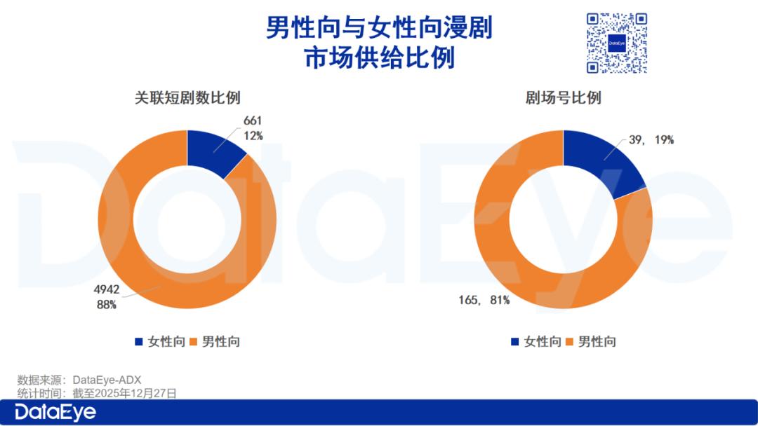 核心疑问摆在所有从业者面前:是市场需求已饱和?还是漫剧需求本身就是伪命题?女频漫剧,真的值得押注吗? 卷成本、卷周期、卷产能、卷AI……漫剧只用一年,就跑完了短剧三年的迭代路。 风口之下,不少AI产品借漫剧东风出圈,行业内也早已达成共识:漫剧的下一个增长点,必然是IP与女频。 但现实是作为漫剧前身的传统2D动态漫,在中国市场深耕近10年仍未破圈;如今的漫剧赛道,也仅有少数作品能在短剧洪流中崭露头角,真正具备标杆 意义的破圈爆款,至今缺席。 一、女频漫剧数据观察 DataEye短剧观察抓取近半年热播的5603部漫剧,进行数据分析发现,与真人短剧中女频占绝对优势的局面不同的是,女性向的漫剧仅占总体的11.98%, 而在已经进行认证的204个抖音端原生剧场号中,主打女频内容的漫剧剧场号仅39个,占比19%。 从每月上线数来看,今年下半年,女性向漫剧的供给数量逐步攀升,在12月到达顶峰,达243部,印证了市场对于女性向漫剧的信心。 从细分题材来看,女性向漫剧中,现代言情题材的漫剧无论是市场供给还是播放量都是最高,供给数量占比超45%,收获累计播放量达12.15亿;其次是 逆袭和古代题材,均占98部,但逆袭题材的女性向 ...