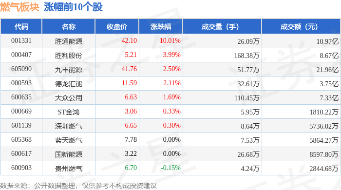 | 代码 | 名称 | 收盘价 | 涨跌幅 | 成交量(手) | 成交额(元) | | | --- | --- | --- | --- | --- | --- | --- | | 001331 | 胜通能源 | 42.10 | 10.01% | 26.09万 | | 10.97亿 | | 000407 | 胜利股份 | 5.21 | 3.99% | 168.38万 | | 8.67亿 | | 605090 | 九丰能源 | 41.76 | 2.50% | 51.77万 | 1 | 21.96亿 | | 000593 | 德龙汇能 | 11.59 | 2.11% | 0 32.61万 | | 3.75亿 | | 600635 | 大众公用 | 6.63 | 1.69% | 110.45万 | | 7.33亿 | | 000669 | ST金湾 | 3.06 | 0.33% | 5.95万 | | 1810.22万 | | 601139 | 深圳燃气 | 6.65 | 0.30% | 8.64万 | | 5736.02万 | | 605368 | 蓝天燃气 | 7.78 | 0.00% | 7.53万 | | 5 ...