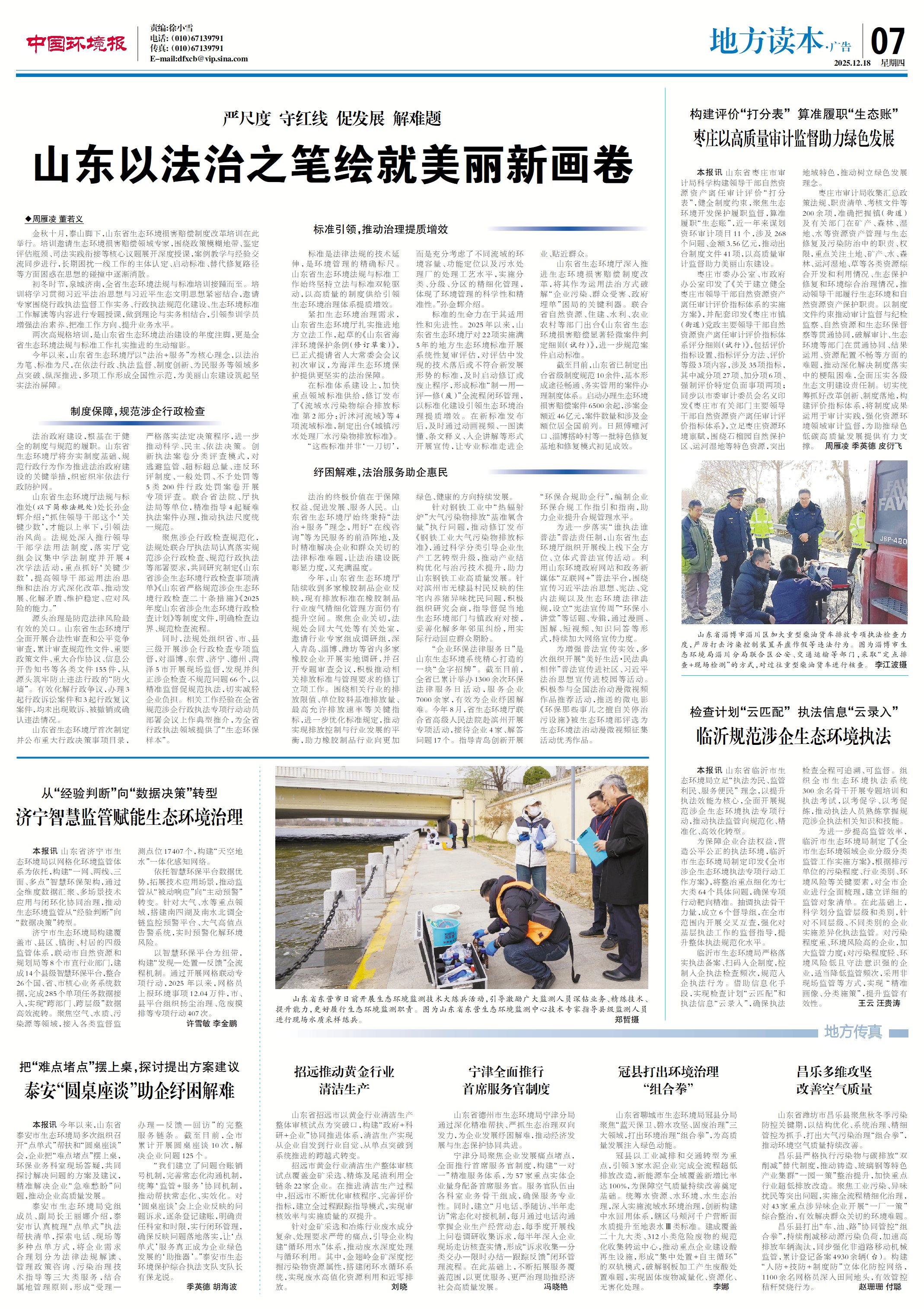 责编:徐小雪 电话:(010)67139791 传真:(010)67139791 E-mail:dfxcb@vip.sina.com 严尺度 守红线 促发展 解难题 山东以法治之笔绘就美ī ◆周雁凌 董若义 金秋十月,泰山脚下,山东省生态环境损害赔偿制度改革培训在此 举行。培训邀请生态环境损害赔偿领域专家,围绕政策模糊地带、鉴定 评估瓶颈、司法实践衔接等核心议题展开深度授课,案例教学与经验交 流同步进行,长期困扰一线工作的主体认定、启动标准、替代修复路径 等方面困惑在思想的碰撞中逐渐消散。 初冬时节,泉城济南,全省生态环境法规与标准培训接踵而至。培 训将学习贯彻习近平法治思想与习近平生态文明思想紧密结合,邀请 专家围绕行政执法监督工作实务、行政执法规范化建设、生态环境标准 工作解读等内容进行专题授课,做到理论与实务相结合,引领参训学员 增强法治素养、把准工作方向、提升业务水平。 两次高规格培训,是山东省生态环境法治建设的年度注脚,更是全 省生态环境法规与标准工作扎实推进的生动缩影。 今年以来,山东省生态环境厅以"法治+服务"为核心理念,以法治 为笔、标准为尺,在依法行政、执法监督、制度创新、为民服务等领域多 ...