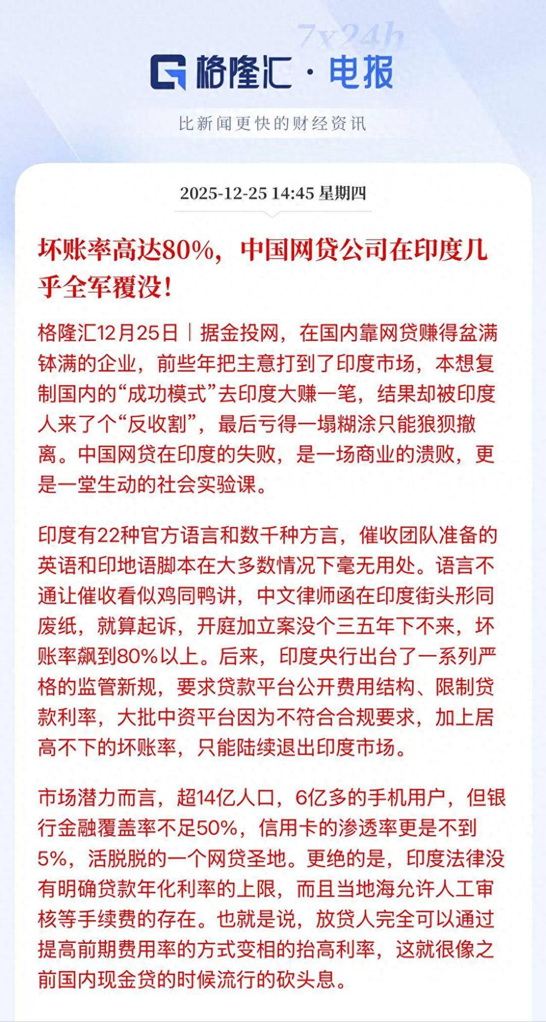 2020 年前后,国内现金贷监管的紧箍咒越收越紧,那些靠 "高息短贷" 赚得盆满钵满的网贷大佬们,把目光投向了南亚次大陆 —— 印度。彼时的德里、孟 买街头,中资网贷平台的广告贴着满墙,APP 下载链接顺着 WhatsApp 疯传,有人喊出 "印度是下一个现金贷金矿",某平台甚至放出 "首月放贷破亿卢比" 的捷报,让更多资本揣着 "复制国内神话" 的野心扎了进来。没人想到,短短两年后,这些平台会以 80% 的坏账率、全员撤离的结局,在印度市场留下一地 鸡毛。 当初,印度是明晃晃的 "网贷天堂" 大佬们扎堆闯印度,不是拍脑袋的赌局 —— 这片市场的 "赚钱基因",几乎踩中了网贷行业的所有痒点: 彼时的中资平台们信心满满:把国内 "快速放贷 + 暴力催收" 的流程照搬过来,稳赚不赔。 现实:从 "割韭菜" 到 "被反收割",踩中所有死穴 2. 印度有 22 种官方语言、数千种方言,催收团队备足的英语、印地语脚本,碰到泰米尔纳德邦的用户,对方说的方言能让催收员彻底懵圈;上门催收 时,拿着中文模板改的 "还款警告函",当地人看都不看就扔在路边 —— 语言不通,让 "催收" 成了鸡同鸭讲的无用功。 3. 司法泥潭:要钱 ...