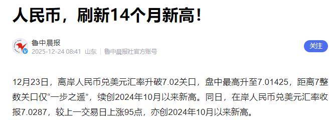 杭州市民张凯(化名)手头上有1万多美元外汇,今年2月份一部分美元(8400美元)办了13个月的定期 存款,到期利率为2.8%,到期收益254.8美元。如果按目前的汇率计算,本金加利息相当于人民币60596 元;而年初的时候,8400美元相当于61629元人民币。也就是说,按人民币计价的话,张凯的8400美元 不但没赚到钱,反而亏1033元人民币。 时隔15个月,人民币汇率再度"破7"。 12月25日,在连日升值后,离岸人民币对美元汇率升破7.0整数关口,盘中最高升值至6.9960,这也是 2024年9月以来首次。同时,在岸人民币对美元汇率同样延续升值走势,逼近7.0关口,盘中最高升值至 7.0052。 有人年初存美元,如今倒亏钱 人民币的大幅升值,也使得美元存款成了"负收益"。 国家金融与发展实验室特聘高级研究员庞溟表示,近期的人民币升值行情,是外部压力趋缓、内部韧性 增强、政策精准调控与市场预期转向等多种因素共同作用的结果。美联储进入降息周期,导致美元指数 显著走弱,带动包括人民币在内的主要非美货币普遍被动升值。市场预期伴随着美联储继续开展降息, 将进一步压制美元长期走势,为人民币提供外部升值空间。 "从内 ...