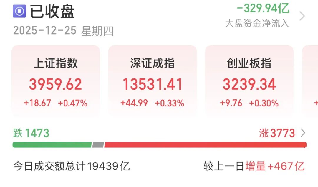 12月26日,A股三大指数小幅收红,为本周行情收官,沪指日线拉出八连阳。全天成交额放大至2.18万亿元,两融余额增至2.55万亿元。 个股跌多涨少 今日午盘前后指数先抑后扬,尾盘再现"V"型拉升,三大指数集体翻红:沪指收涨0.1%报3963.68点,实现八连阳;创业板指收涨0.14%报3243.88点。深证 成指、北证50、沪深300、上证50微红,科创50微跌。 受访人士指出,年末数据和政策均处真空期,不确定性升温,预计下周指数仍以震荡整理为主,高位获利盘有待消化。 量能显著放大,较上一交易日激增2372亿元,日成交额升至2.18万亿元;杠杆资金持续加码,沪深京两融余额增至2.55万亿元。 | | 东财概念排数 | | | 东财行业排数 | | | A股市场核心指数 | | | | --- | --- | --- | --- | --- | --- | --- | --- | --- | --- | | 液冷概念 | 小金属概念 | 苹果概念 | 通信设备 | | 基本金属 | 东方财富全A 0.17% | | 国证1000 0.46% | | | -1.59% | 3.44% | -1.89% | -1. ...