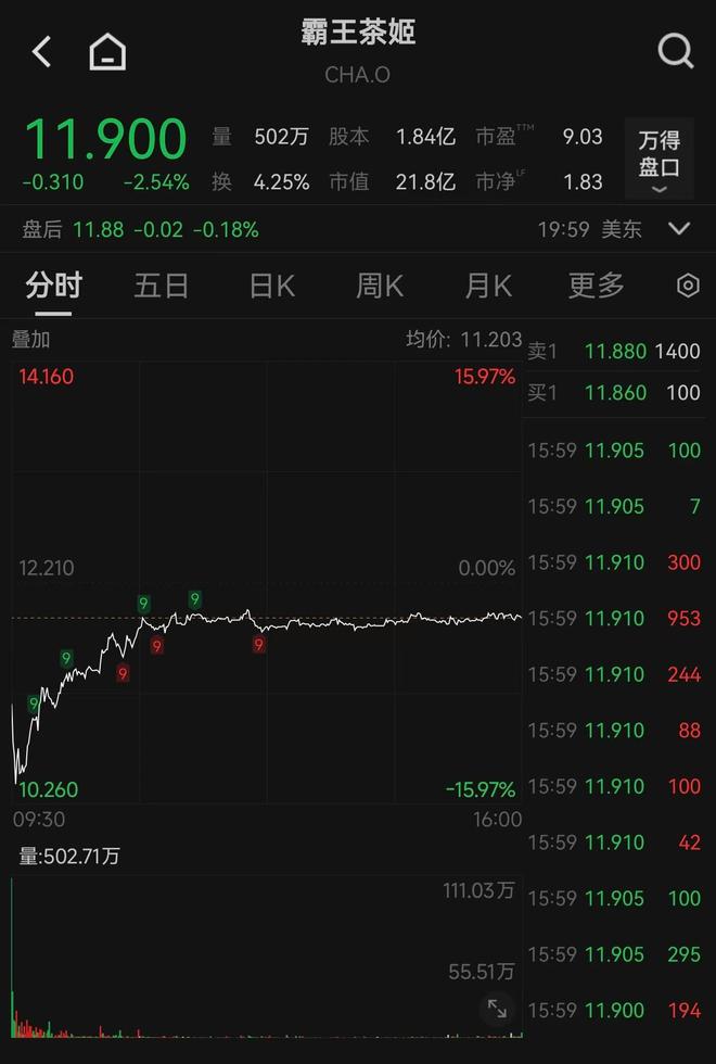 | < ロ | 霸王茶姬 | | | --- | --- | --- | | CHA.O | | | | 11.900 量 502万 股本 1.84亿 市盈" 9.03 | 万得 | | | 盘口 | -0.310 -2.54% 换 4.25% 市值 21.8亿 市净 1.83 | | | 盘后 11.88 -0.02 -0.18% | 19:59 美东 V | | | 分时 | 五日 日K 周K 更多 | 6 | | 叠加 均价: 11.203 卖1 11.880 1400 14.160 15.97% | | | | 买1 11.860 100 | | | | 15:59 11.905 100 | | | | 15:59 11.905 | | 7 | | 0.00% 15.59 11.910 300 12.210 | | | | Mantination 15:59 11.910 MM | | 953 | | 15:59 11.910 | | 244 | | 15:59 11.910 | | 88 | | -1597% 15:59 11.910 10.260 | | 100 | | 16:00 09:30 | ...