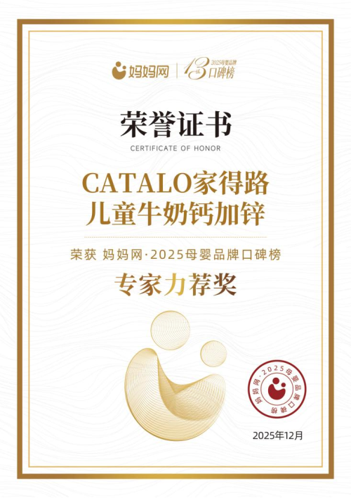 CATALO 家得路儿童牛奶钙加锌荣获妈妈网2025母婴品牌口碑榜“专家力荐奖”!