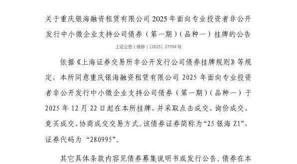 依据《上海证券交易所非公开发行公司债券挂牌规则》等规定,上交所同意重庆银海融资租赁有限公司 2025年面向专业投资者非公开发行中小微企业支持公司债券(第一期)(品种二)于2025年12月22日起 在上交所挂牌,并采取点击成交、询价成交、竞买成交、协商成交交易方式。该债券证券简称为"25银 海Z2",证券代码为"280996"。 来源:市场资讯 12月19日,上交所发布关于重庆银海融资租赁有限公司2025年面向专业投资者非公开发行中小微企业支 持公司债券(第一期)(品种二)挂牌的公告。 ...