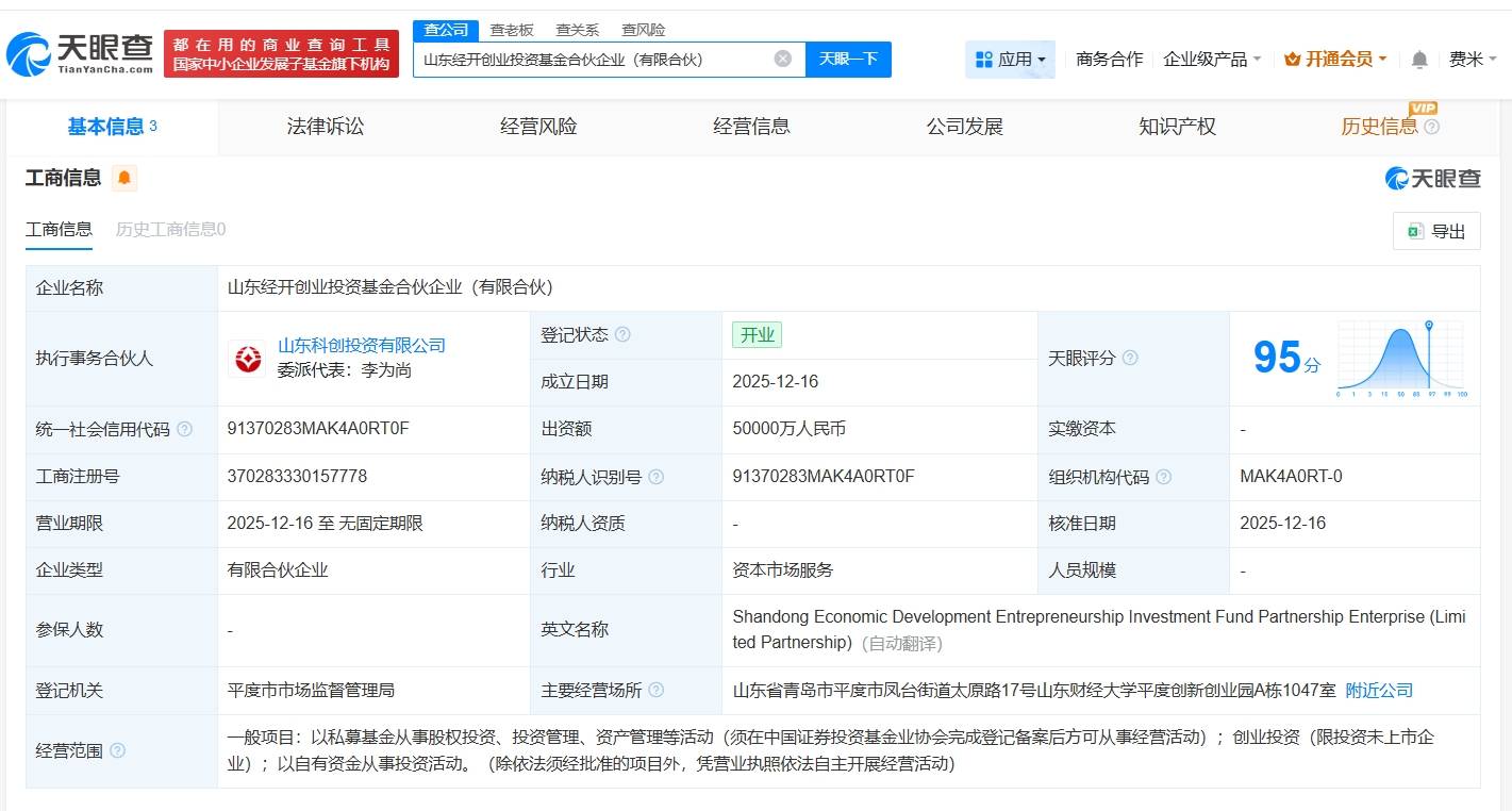 雷达财经讯,天眼查App显示,近日,山东经开创业投资基金合伙企业(有限合伙)成立,执行事务合伙人为山东科创投资有限公司,出资额5亿人民币, 经营范围为以私募基金从事股权投资、投资管理、资产管理等活动,创业投资,以自有资金从事投资活动,由济宁经开投资服务有限公司、济宁市国有资产 投资控股有限公司、山东科创投资有限公司共同出资。 | | 意公司 在用的窗业首间 | 查老板 音关系 查风险 | | | | --- | --- | --- | --- | --- | | | 好机 维修理于虚分之日 | 山东经开创业投资基金合伙企业(有限合伙) | 8 天眼一下 脂 应用 ▼ | 商务合作 1 | | 基本信息 3 | 法律诉讼 | 经营风险 | 经营信息 公司发展 | 知 | | 工商信息 ● | | | | | | 工商信息 历史丁商信息0 | | | | | | 企业名称 | 山东经开创业投资基金合伙企业(有限合伙) | | | | | | 山东科创投资有限公司 | 登记状态 2 | 开业 | | | 执行事务合伙人 | 委派代表:李为尚 | | | 天眼评分 2 | | | | 成立日期 | 2025-12-1 ...