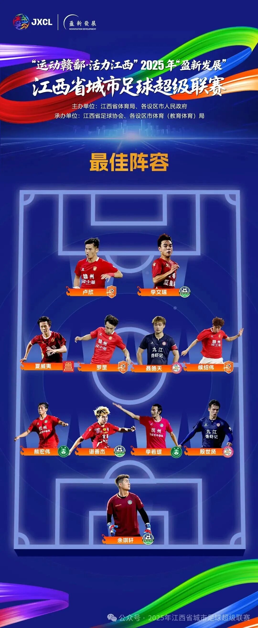 为激励联赛中表现突出的运动员,树立竞技典范,弘扬体育精神,依据《2025年江西省城市足球超级联赛竞赛规程》相关规定,经各参赛队推荐,评审小 组依据球员上场时间、技战术表现、体育道德风尚等方面进行综合评审,最终确定本届联赛"最佳阵容"名单。阵容采用1-4-4-2阵型,具体名单如下: 一、门将:余琪轩(宜春); 二、后卫:熊宏伟(抚州)、谌善杰(宜春)、李若琨(抚州)、殷世贤(九江); 三、中场:夏威夷(南昌)、罗罡(赣州)、聂皓天(九江)、侯绍伟(赣州); 四、前锋:卢欣(赣州)、李文瑞(宜春)。 来源:2025年江西省城市足球超级联赛、江西宣传 编辑:徐麟 ...