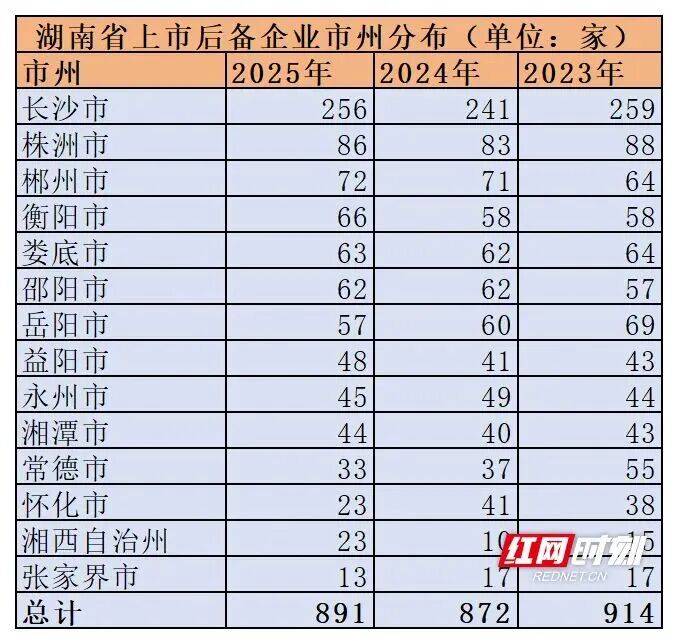 12月22日,省委金融办对2025年湖南省上市后备企业资源库入库企业名单进行公示,共有891家企业入库。 从市州分布来看,长沙市入库企业数量遥遥领先,达256家;其次是株洲市86家、郴州市72家;衡阳市、邵阳市、娄底 市、岳阳市、 益阳市、永州市、湘潭市上市后备企业数量均 达40家及以上。 | | 湖南省上市后备企业市州分布(单位:家) | | | | --- | --- | --- | --- | | 市州 | 2025年 | 2024年 | 2023年 | | 长沙市 | 256 | 241 | 259 | | 株洲市 | 86 | 83 | 88 | | 柄 市 | 72 | 71 | 64 | | 衡阳市 | 66 | 58 | 58 | | 娄底市 | 63 | 62 | 64 | | 邵阳市 | 62 | 62 | 57 | | 岳阳市 | 57 | 60 | 69 | | 益阳市 | 48 | 41 | 43 | | 水州市 | 45 | 49 | 44 | | 湘潭市 | 44 | 40 | 43 | | 常德市 | 33 | 37 | 55 | | 怀化市 | 23 | 41 | 38 | ...